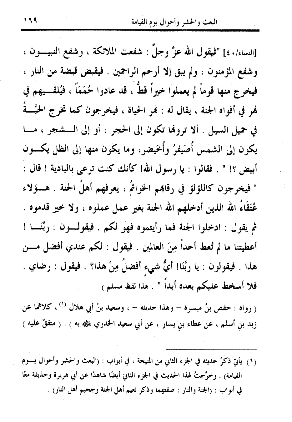 [النساء: 40] "فيقول الله -عَزَّ وَجَلَّ-: شفعت الملائكة، وشفع النبيون، وشفع المؤمنون، ولم يبق إلا أرحم الراحمين. فيقبض قبضة من النار، فيخرج منها قومًا لم يعملوا خيرًا قطُّ، قد عادوا حُمَمًا، فيُلقيهم في نهر في أفواه الجنة، يقال له: نهر الحياة، فيخرجون كما تخرج الحبَّةُ في حميل السيل. ألا ترونها تكون إلى الحجر، أو إلى الشجر، ما يكون إلى الشمس أُصَيفر وأُخَيضر، وما يكون منها إلى الظل يكون أبيض؟! ". فقالوا: يا رسول الله! كأنك كنت ترعى بالبادية! قال: "فيخرجون كاللؤلؤ في رقابهم الخواتم، يعرفهم أهلُ الجنَّة. هؤلاء عُتَقاء الله الذين أدخلهم الله الجنة بغير عمل عملوه، ولا خير قدموه. ثمّ يقول: أدخلوا الجنَّة فما رأيتموه فهو لكم. فيقولون: ربَّنَا! أعطيتنا ما لم تُعط أحدًا مِنَ العالمين. فيقول: لكم عندي، أفضل من هذا. فيقولون: يا ربَّنَا! أيُّ شيءٍ أفضلُ مِنْ هذا؟. فيقول: رضاي. فلا أسخط عليكم بعده أبدًا". هذا لفظ مسلم).