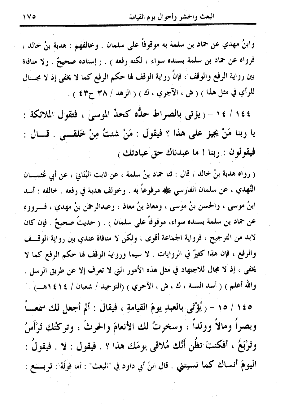 (رواه هدبة بنُ خالد، قال: ثنا حماد بنُ سلمة، عن ثابت البُنَاني، عن أبي عُثمان النَّهدي، عن سلمان الفارسي - رضي الله عنه - مرفوعًا به. وخولف هدبة في رفعه, خالفه: أسد ابنُ موسى، والحسن بنُ موسى، ومعاذ بنُ معاد، وعبد الرحمن بنُ مهدي، فرووه عن حماد بن سلمة بسنده سواء، موقوفًا على سلمان). (حديثٌ صحيحٌ. فإن كان لابد من الترجيح، فرواية الجماعة أقوى، ولكن لا منافاة عندي بين رواية الوقف والرفع، فإن هذا كثيرٌ في الروايات. لا سيما ورواية الرقف لها حكم الرفع كما لا يخفى، إذ لا مجال للاجتهاد في مثل هذه الأمور التي لا تعرف إلا عن طريق الرسل. والله أعلم) (أسد السنة، ك، ش، الآجري) (التوحيد / شعبان / 1414 هـ).
