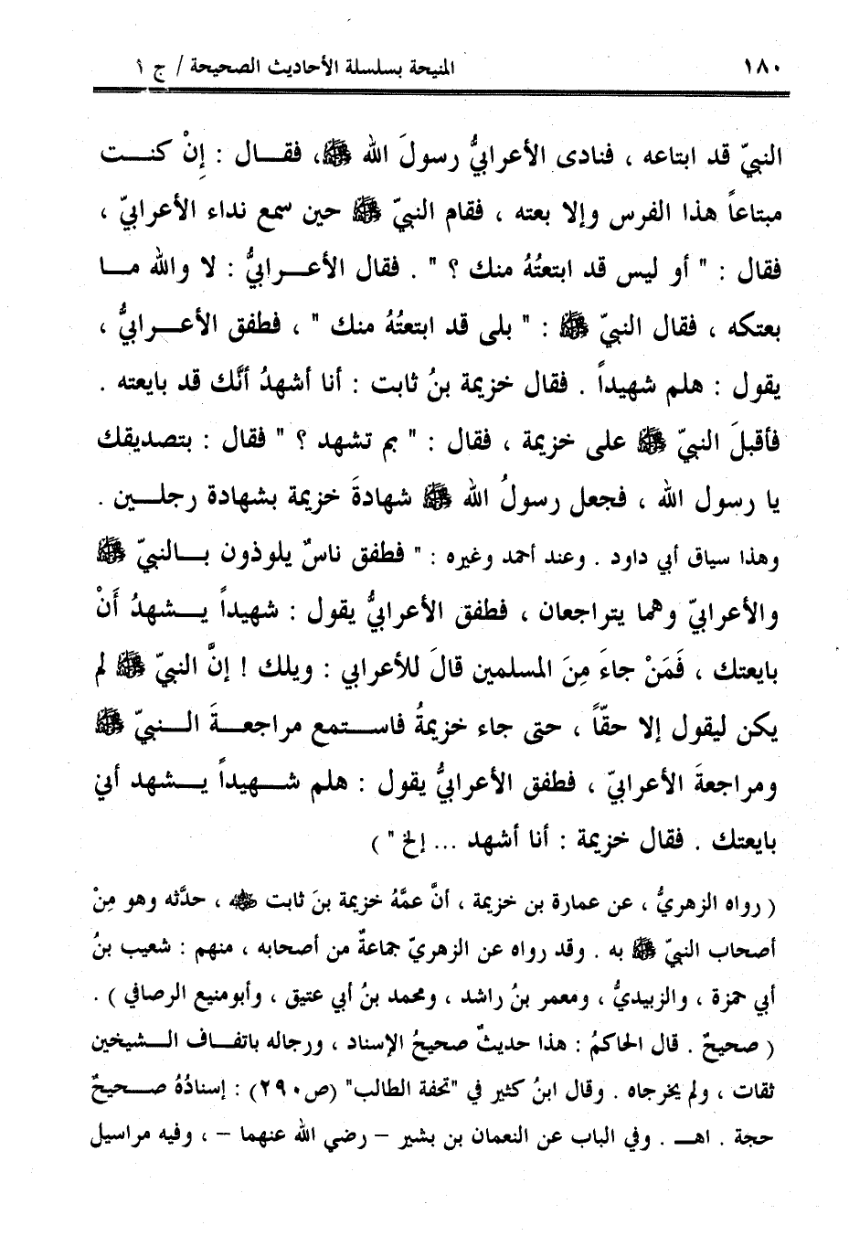 (رواه الزهريُّ، عن عمارة بن خزيمة، أنَّ عمَّهُ خزيمة بنَ ثابت - رضي الله عنه -، حدَّثه وهو مِنْ أصحاب النبيّ - صلى الله عليه وسلم - به. وقد رواه عن الزهريّ جماعةٌ من أصحابه، منهم: شعيب بنُ أبي حمزة، والزبيديُّ، ومعمر بنُ راشد، ومحمد بنُ أبي عتيق، وأبو منيع الرصافي).