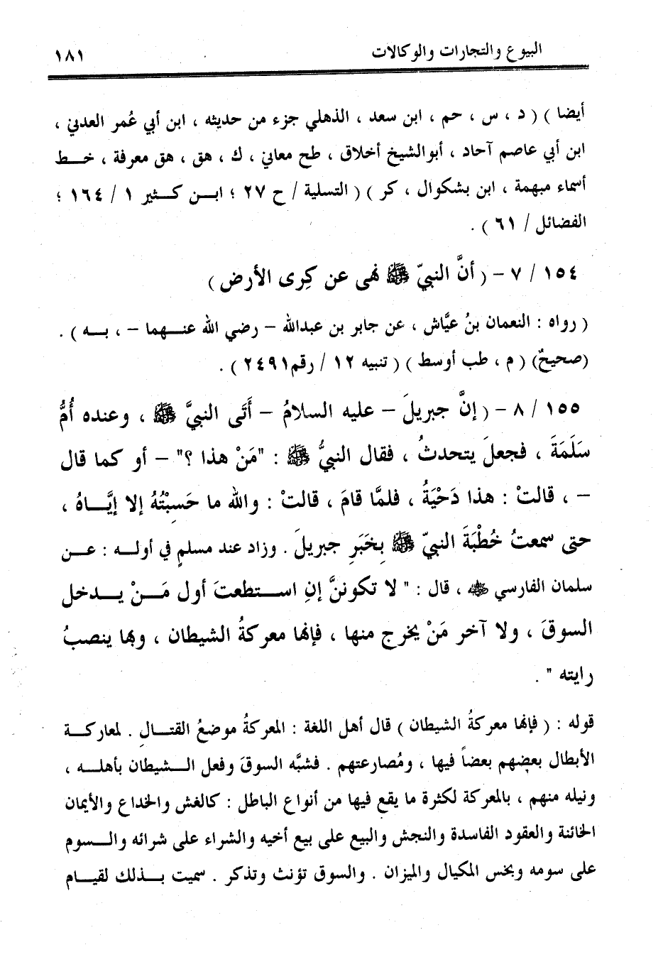 155/ 8 - (إنَّ جبريلَ - عليه السلام - أتي النبيَّ - صلى الله عليه وسلم -، وعنده أُمُّ سَلَمَةَ، فجعلَ يتحدثُ فقال النبيُّ - صلى الله عليه وسلم -: "مَنْ هذا؟ " -أو كما قال-، قالتْ: هذا دَحْيَةُ, فلمَّا قامَ, قالتْ: والله ما حَسِبْتُهُ إلا إيَّاهُ، حتى سمعتُ خُطْبَةَ النبيّ - صلى الله عليه وسلم - بِخَبَرِ جبريلَ. وزاد عند مسلمٍ في أوله: عن سلمان الفارسي - رضي الله عنه -، قال: "لا تكوننَّ إنِ استطعتَ أول مَنْ يدخل السوقَ، ولا آخر مَنْ يخرج منها، فإنها معركةُ الشيطان، وبها ينصبُ رايته".