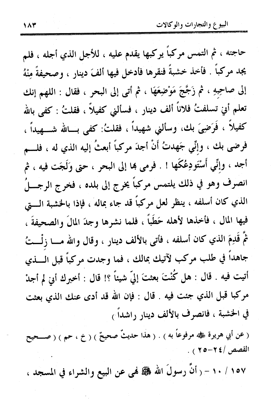حاجته، ثم التمس مركبًا يركبها يقدم عليه، للأجل الذي أجله، فلم يجد مركبًا. فأخذ خشبةً فنقرها فأدخل فيها ألفَ دينار، وصحيفةً مِنْهُ إلى صاحِبِهِ، ثم زَجَّجَ مَوْضِعَهَا، ثم أتى إلى البحر، فقال: اللهم إنك تعلم أني تسلفتُ فلانًا ألف دينار، فسألني كفيلاً، فقلتُ: كفى بالله كفيلاً، فَرَضى بك، وسألني شهيدًا، فقلتُ: كفى بالله شهيدًا، فرضى بك، وإِنِّي جَهدتُ أَنْ أجدَ مركبًا أبعثُ إليه الذي له، فلم أجد، وإِنِّي أَسْتَودِعُكَها!. فرمى بها إلى البحر، حتى وَلَجَت فيه، ثم انصرف وهو في ذلك يلتمس مركبًا يخرج إلى بلده، فخرج الرجلُ الذي كان أسلفه، ينظر لعل مركبًا قد جاء بماله، فإذا بالخشبة التي فيها المال، فأخذها لأهله حَطَبًا، فلما نشرها وجدَ المالَ والصحيفةَ، ثمَّ قَدِمَ الذي كان أسلفه، فأتى بالألف دينار، وقال والله ما زِلْتُ جاهدًا في طلب مركب لآتيك بمالك، فما وجدت مركبًا قبل الذي أتيت فيه. قال: هل كُنْتَ بعثتَ إليّ شيئًا؟! قال: أخبرك أني لم أجدْ مركبا قبل الذي جئت فيه. قال: فإن الله قد أدى عنك الذي بعثت في الخشبة، فانصرف بالألف دينار راشدًا).