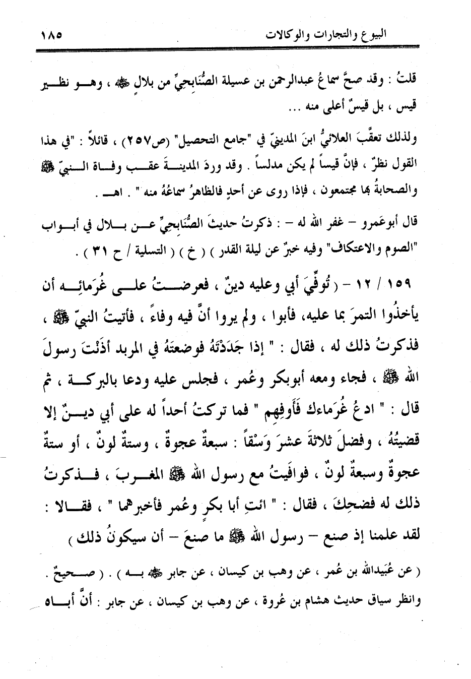 159/ 12 - (تُوفِّيَ أبي وعليه دينٌ، فعرضتُ على غُرَماِئه أن يأخذُوا التمرَ بما عليه، فأبوا، ولم يروا أنَّ فيه وفاءً، فأتيتُ النبيّ - صلى الله عليه وسلم -، فذكرتُ ذلك له، فقال: "إذا جَدَدْتَةُ فوضعتَهُ في المربد أذَنْتَ رسولَ الله - صلى الله عليه وسلم -، فجاء ومعه أبو بكر وعُمر، فجلس عليه ودعا بالبركة، ثم قال: "ادعُ غُرَماءك فَأَوفِهِم" فما تركتُ أحدًا له على أبي دينٌ إلا قضيتُهُ، وفضلَ ثلاثةَ عشرَ وَسْقًا: سبعةٌ عجوةٌ، وستةٌ لونٌ، أو ستةٌ عجوةٌ وسبعةٌ لونٌ، فوافَيتُ مع رسول الله - صلى الله عليه وسلم - المغربَ، فذكرتُ ذلك له فضحِكَ، فقال: "ائتِ أبا بكرٍ وعُمر فأخبرهما"، فقالا: لقد علمنا إذ صنع -رسول الله - صلى الله عليه وسلم - ما صنعَ- أن سيكونُ ذلك).