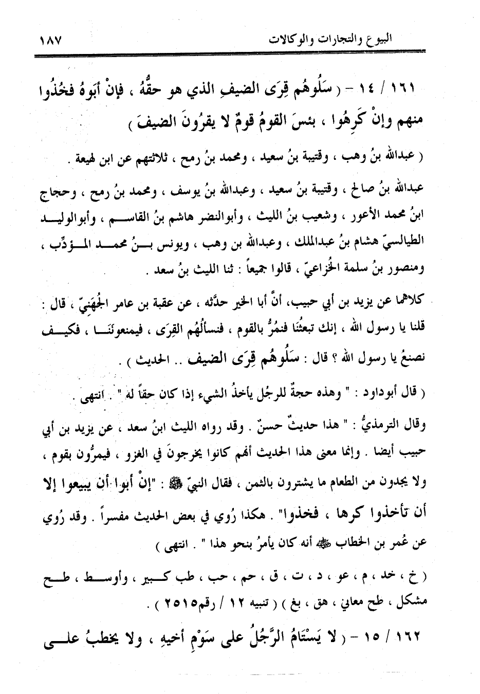 161/ 14 - (سَلُوهُم قِرَى الضيفِ الذي هو حقُّهُ، فإنْ أبَوهُ فخُذُوا منهم وإنْ كَرِهُوا، بئسَ القومُ قومٌ لا يقرُونَ الضيفَ).