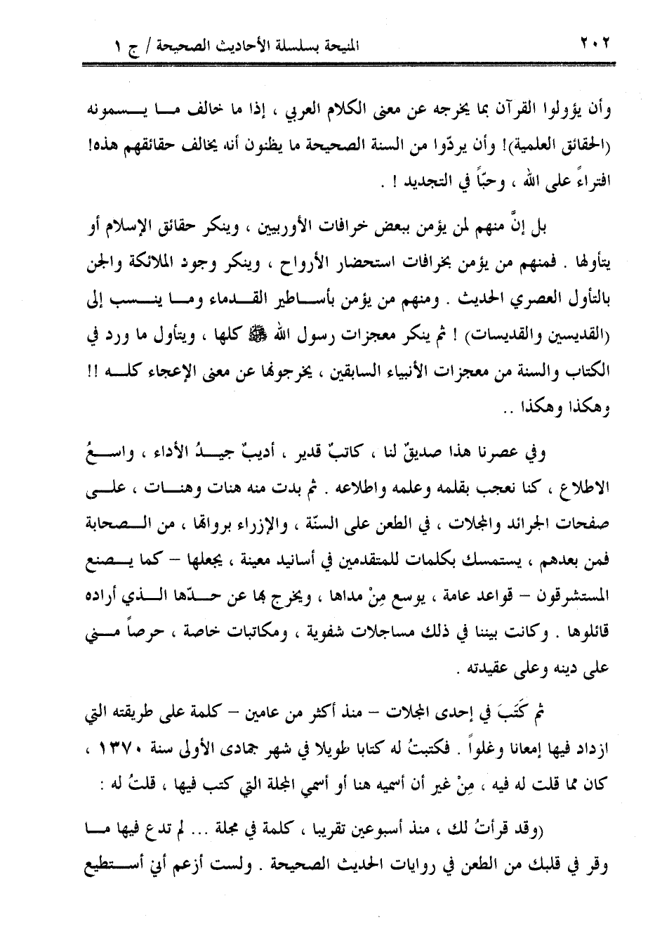 وفي عصرنا هذا صديقٌ لنا، كاتبٌ قدير، أديبٌ جيدُ الأداء، واسعُ الاطلاع، كنا نعجب بقلمه وعلمه واطلاعه. ثم بدت منه هنات وهنات، على صفحات الجرائد والمجلات، في الطعن على السنّة، والإزراء برواتها، من الصحابة فمن بعدهم، يستمسك بكلمات للمتقدمين في أسانيد معينة، يجعلها -كما يصنع المستشرقون- قواعد عامة، يوسع مِنْ مداها، ويخرج بها عن حدّها الذي أراده قائلوها. وكانت بيننا في ذلك مساجلات شفوية، ومكاتبات خاصة، حرصًا مني على دينه وعلى عقيدته.