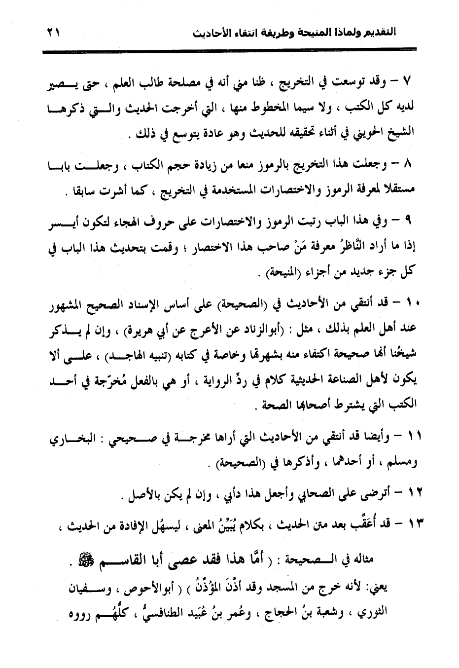 7 - وقد توسعت في التخريج، ظنًا مني أنه في مصلحة طالب العلم، حتى يصير لديه كل الكتب، ولا سيما المخطوط منها، التي أخرجت الحديث والتي ذكرها الشيخ الحويني في أثناء تحقيقه للحديث وهو عادة يتوسع في ذلك.