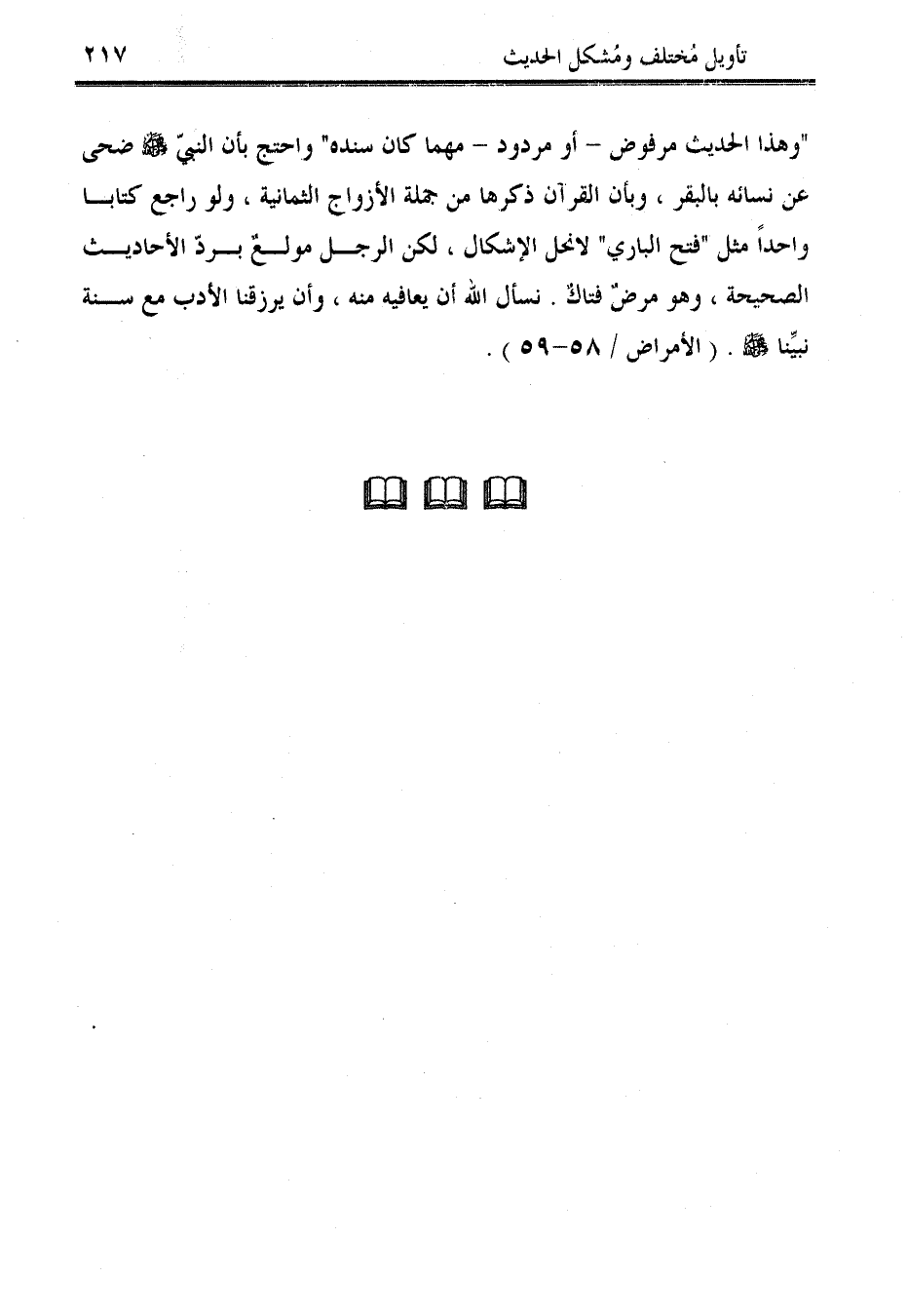 "وهذا الحديث مرفوض -أو مردود- مهما كان سنده" واحتج بأن النبيّ - صلى الله عليه وسلم - ضحى عن نسائه بالبقر، وبأن القرآن ذكرها من جملة الأزواج الثمانية، ولو راجع كتابًا واحدًا مثل "فتح الباري" لانحل الإشكال، لكن الرجل مولعٌ بردّ الأحاديث الصحيحة، وهو مرضٌ فتاكٌ. نسأل الله أن يعافيه منه، وأن يرزقنا الأدب مع سنة نبيِّنا - صلى الله عليه وسلم -. (الأمراض / 58 - 59).