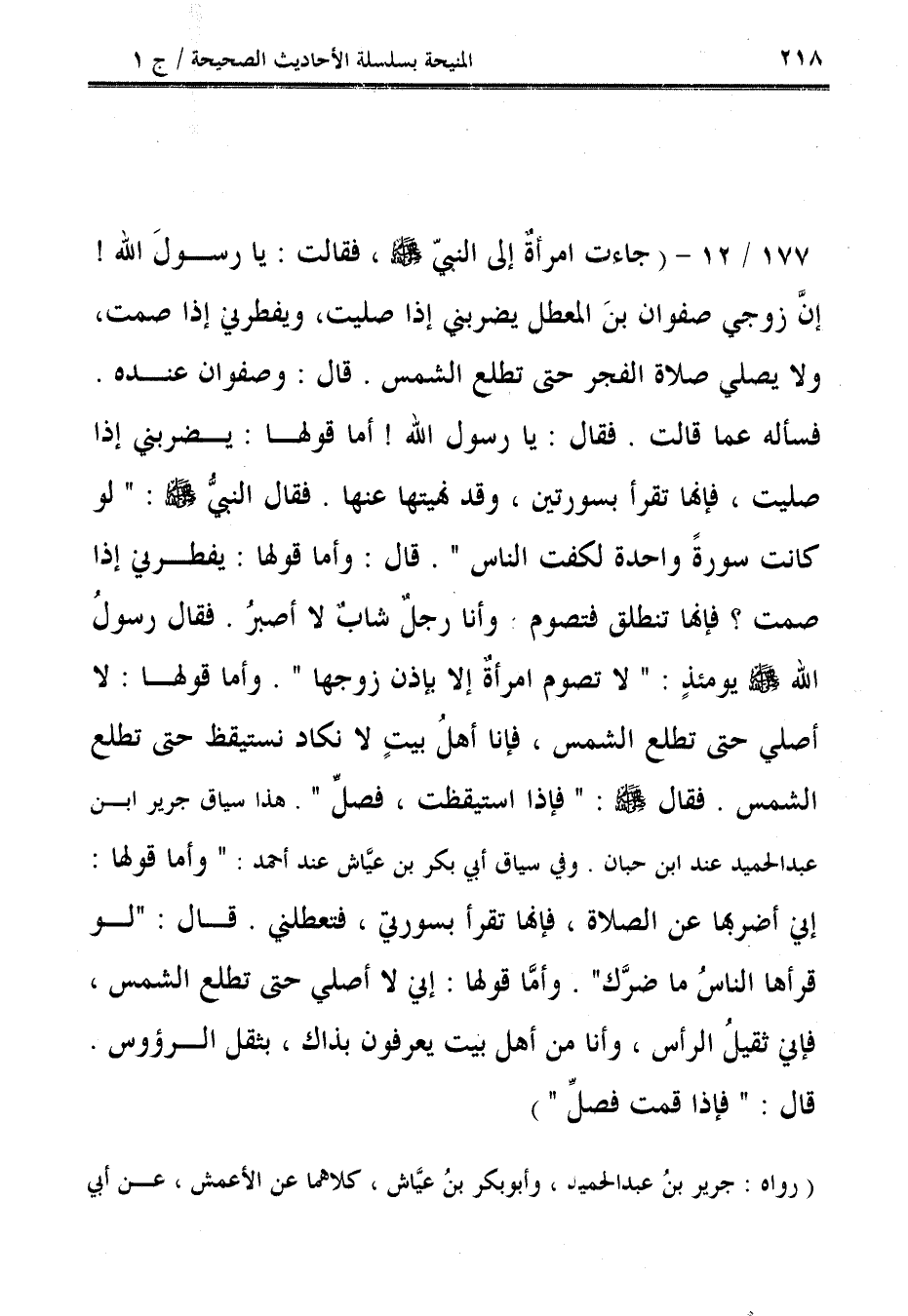177/ 12 - (جاءت امرأةٌ إلى النبيّ - صلى الله عليه وسلم -، فقالت: يا رسولَ الله! إنَّ زوجي صفوان بنَ المعطل يضربني إذا صليت، ويفطرني إذا صمت، ولا يصلي صلاة الفجر حتى تطلع الشمس. قال: وصفوان عنده.