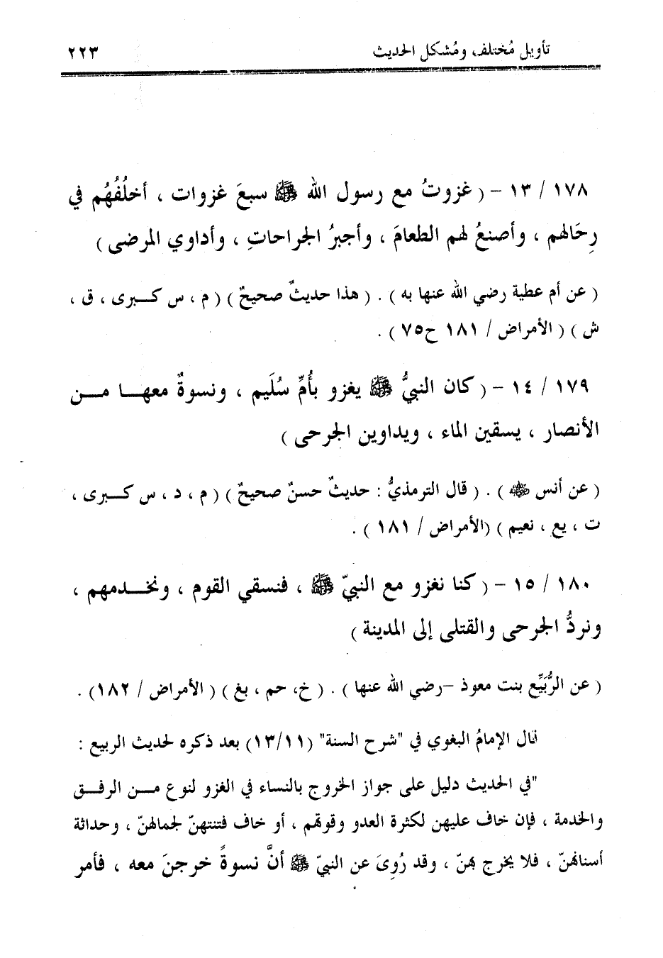 179/ 14 - (كان النبيُّ - صلى الله عليه وسلم - يغزو بأُمِّ سُلَيم، ونسوةٌ معها من الأنصار، يسقين الماء، ويداوين الجرحى).