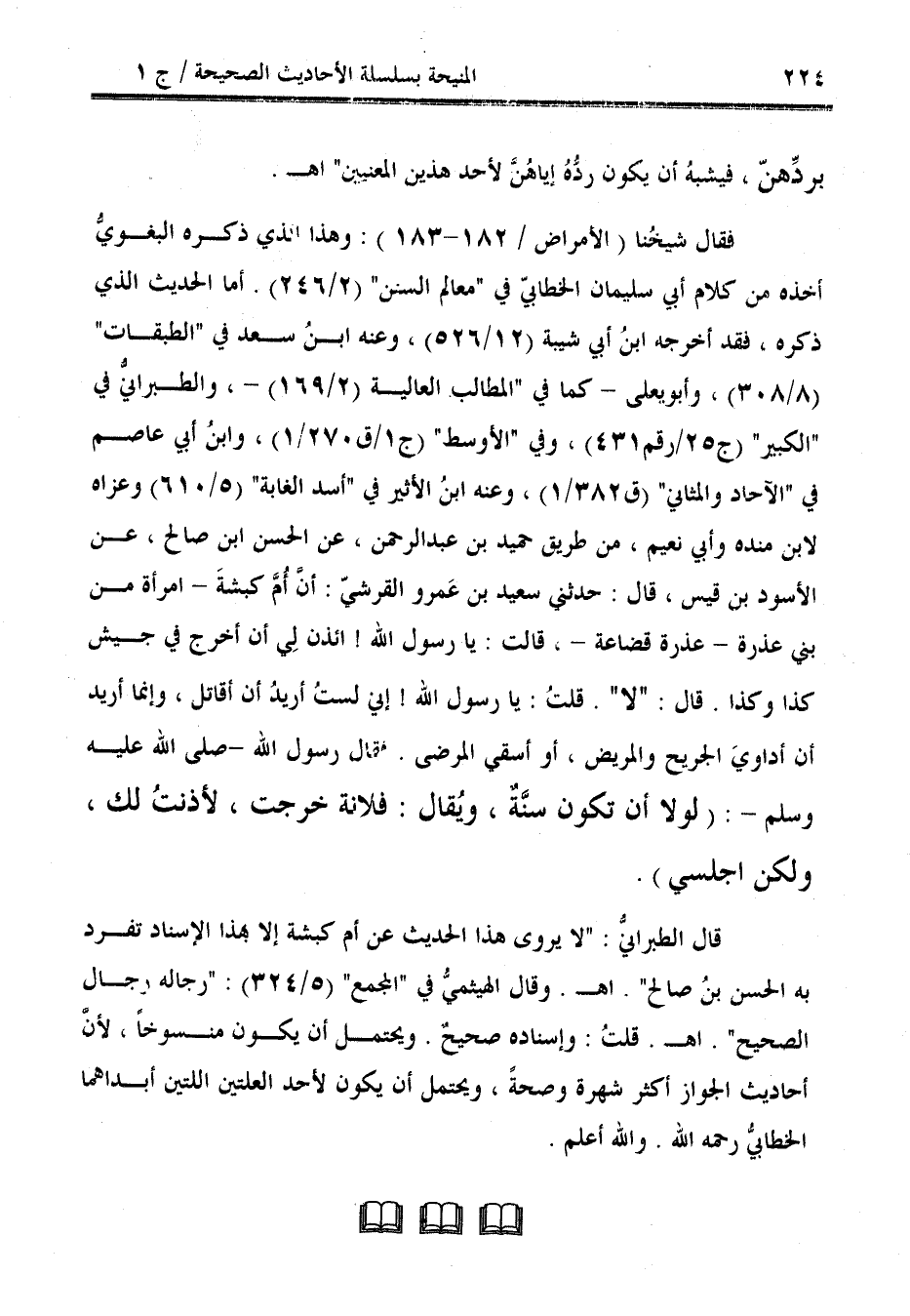 فقال شيخُنا (الأمراض / 182 - 183): وهذا الذي ذكره البغويُ أخذه من كَلام أبي سليمان الخطابيّ في "معالم السنن" (2/ 246). أما الحديث الذي ذكره، فقد أخرجه ابنُ أبي شيبة (12/ 526)، وعنه ابنُ سعد في "الطبقات" (8/ 308)، وأبو يعلى -كما في "المطالب العالية (2/ 169) -، والطبرانيُّ في "الكبير" (ج 25 / رقم 431)، وفي "الأوسط" (ج 1 / ق 270/ 1)، وابنُ أبي عاصم في "الآحاد والمثاني" (ق 382/ 1)، وعنه ابنُ الأثير في "أسد الغابة" (5/ 610) وعزاه لابن منده وأبي نعيم، من طريق حميد بن عبد الرحمن، عن الحسن ابن صالح، عن الأسود بن قيس، قال: حدثني سعيد بن عَمرو القرشيّ: أن أُمَّ كبشةَ امرأة من بني عذرة -عذرة قضاعة-، قالت: يا رسول الله! ائذن لِي أن أخرج في جيش كذا وكذا. قال: "لا". قلتُ: يا رسول الله! إني لستُ أريدُ أن أقاتل، وإنما أريد أن أداويَ الجريح والمريض، أو أسقي المرضى. فقال رسول الله - صلى الله عليه وسلم -: (لولا أن تكون سنَّةٌ، ويُقال: فلانة خرجت، لأذنتُ لك، ولكن اجلسي).