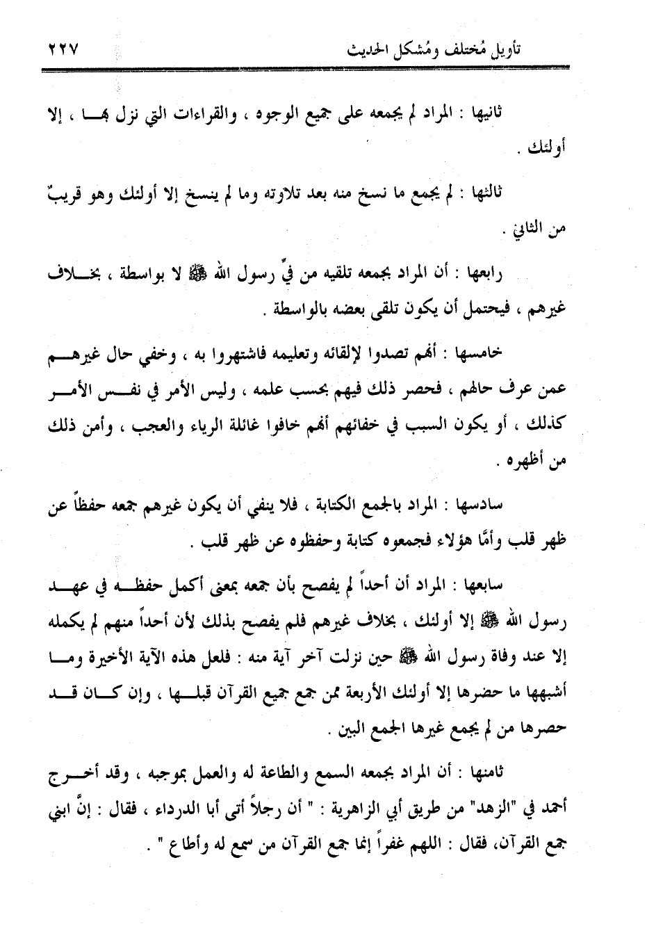 سابعها: المراد أن أحدًا لم يفصح بأن جمعه بمعنى أكمل حفظه في عهد رسول الله - صلى الله عليه وسلم - إلا أولئك، بخلاف غيرهم فلم يفصح بذلك لأن أحدًا منهم لم يكمله إلا عند وفاة رسول الله - صلى الله عليه وسلم - حين نزلت آخر آية منه: فلعل هذه الآية الأخيرة وما أشبهها ما حضرها إلا أولئك الأربعة ممن جمع جميع القرآن قبلها، وإن كان قد حصرها من لم يجمع غيرها الجمع البين.