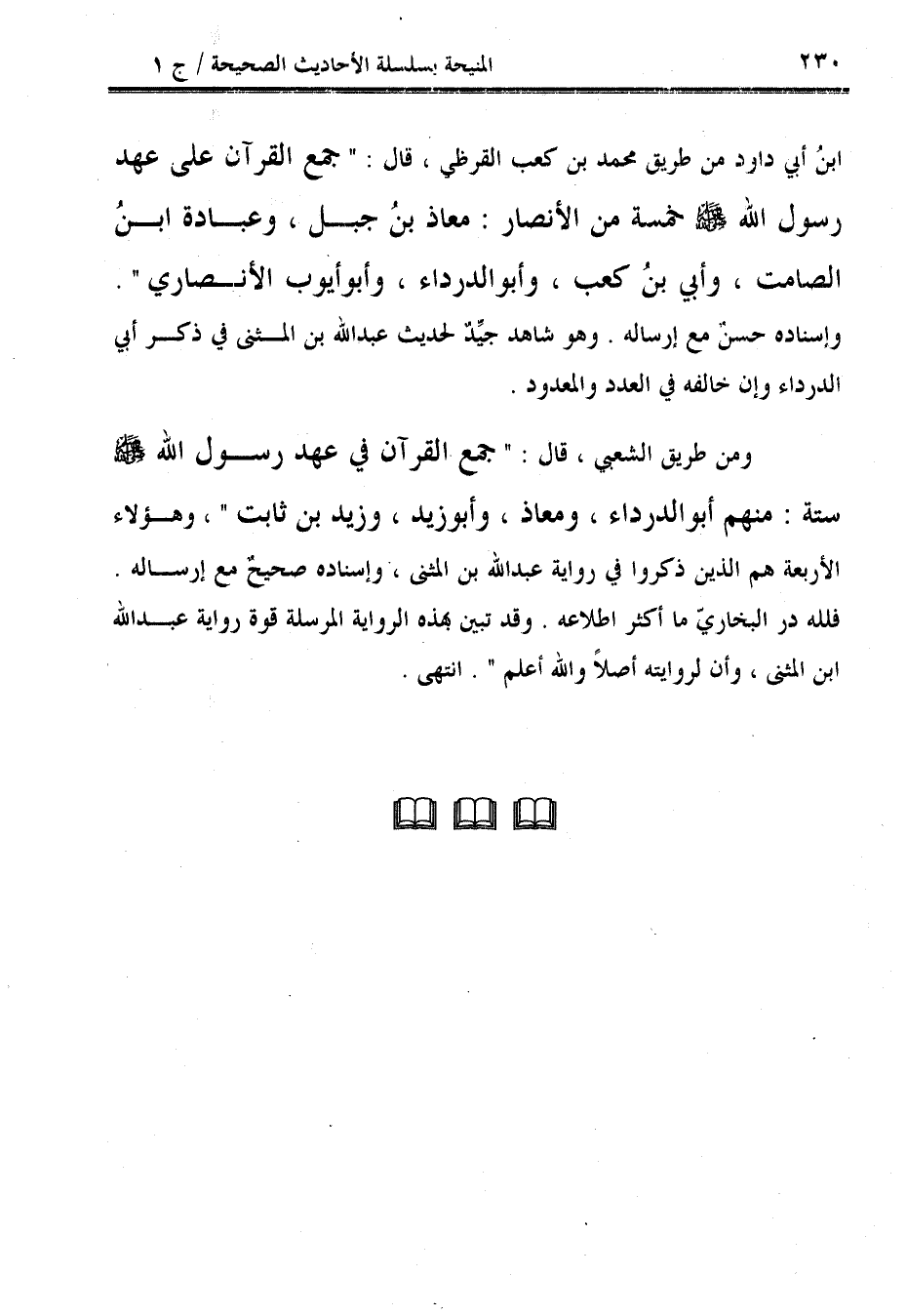 ومن طريق الشعبي، قال: "جمع القرآن في عهد رسول الله - صلى الله عليه وسلم - ستة: منهم أبو الدرداء، ومعاذ، وأبو زيد، وزيد بن ثابت"، وهؤلاء الأربعة هم الذين ذكروا في رواية عبد الله بن المثنى، وإسناده صحيحٌ مع إرساله.
