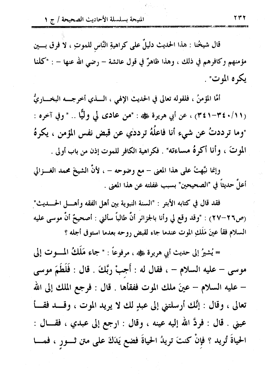 فقد قال في كتابه الأبتر: "السنة النبوية بين أهل الفقه وأهل الحديث" (ص 26 - 27): "وقد وقع لي وأنا بالجزائر أن طالبًا سألني: أصحيحٌ أن موسى عليه السلام فقأ عينَ مَلَكِ الموت عندما جاء لقبض روحه بعدما استوفى أجله؟