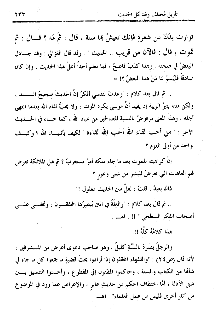 .. ثم قال بعد كلام: "وعدتُ لنفسي أفكرُ إن الحديثَ صحيحُ السند، ولكن متنه يثيرُ الريبة إذ يفيد أن موسى يكره الموت، ولا يحبُّ لقاء الله بعدما انتهى أجله، وهذا المعنى مرفوضٌ بالنسبة للصالحين من عباد الله، كما جاء في الحديث الآخر: "من أحب لقاء الله أحب الله لقاءه" فكيف بأنبياء الله؟ وكيف بواحد من أولي العزم؟