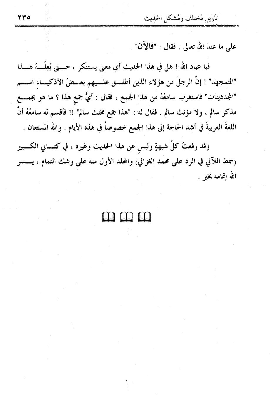 فيا عباد الله! هل في هذا الحديث أي معنى يستنكر، حتى يُعِلّهُ هذا "المتمجهد"! إن الرجل من هؤلاء الذين أطلق عليهم بعضُ الأذكياءِ اسم "المجددينات" فاستغرب سامعُهُ من هذا الجمع، فقال: أيُّ جمعٍ هذا؟ ما هو بجمع مذكر سالم، ولا مؤنث سالم. فقال له: "هذا جمع مخنث سالم"!! فأقسم له سامعُهُ أن اللغةَ العربيةَ في أشد الحاجة إلى هذا الجمع خصوصًا في هذه الأيام. والله المستعان.