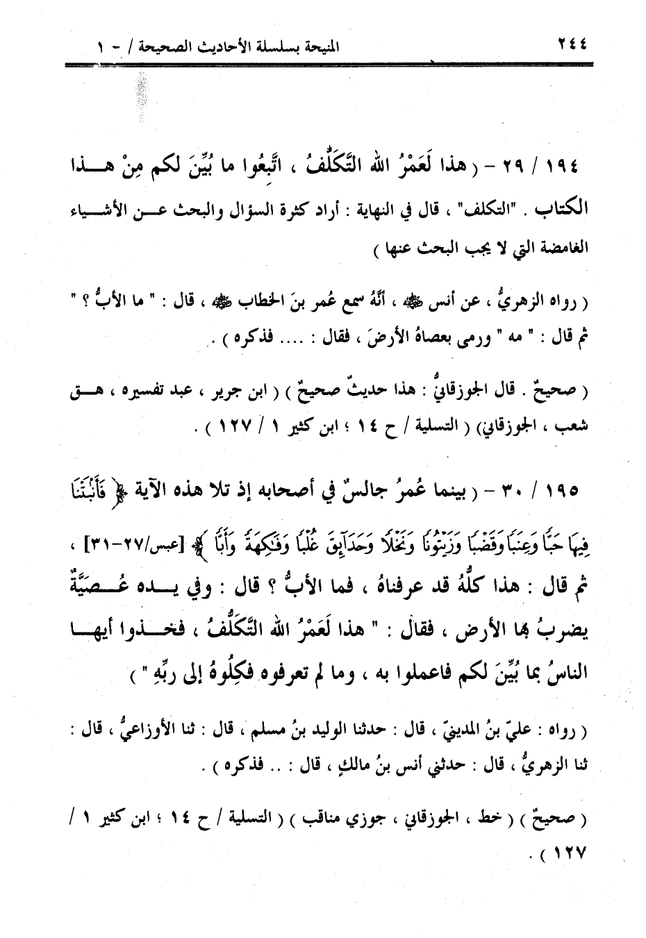 194/ 29 - (هذا لَعَمْرُ الله التَّكَلفُ، اتَّبِعُوا ما بُيِّنَ لكم مِنْ هذا الكتاب "التكلف"، قال في النهاية: أراد كثرة السؤال والبحث عن الأشياء الغامضة التي لا يجب البحث عنها).