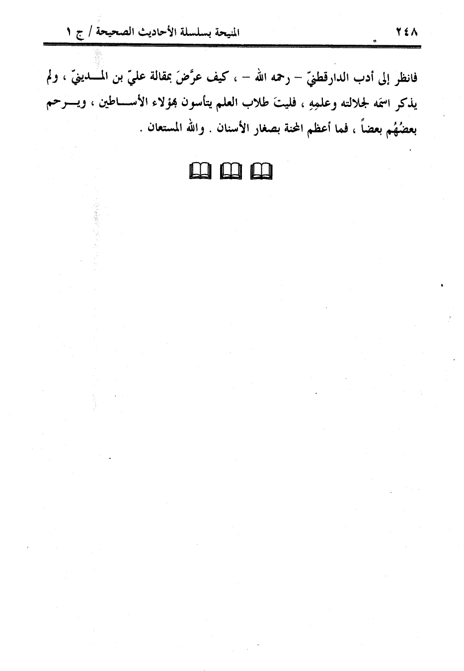 فانظر إلى أدب الدارقطنيّ - رحمه الله -، كيف عرَّضَ بمقالة عليّ بن المدينيّ، ولم يذكر اسمَه لجلالته وعلمِهِ، فليتَ طلاب العلم يتأسون بهؤلاء الأساطين، ويرحم بعضُهُم بعضًا، فما أعظم المحنة بصغار الأسنان. والله المستعان.
