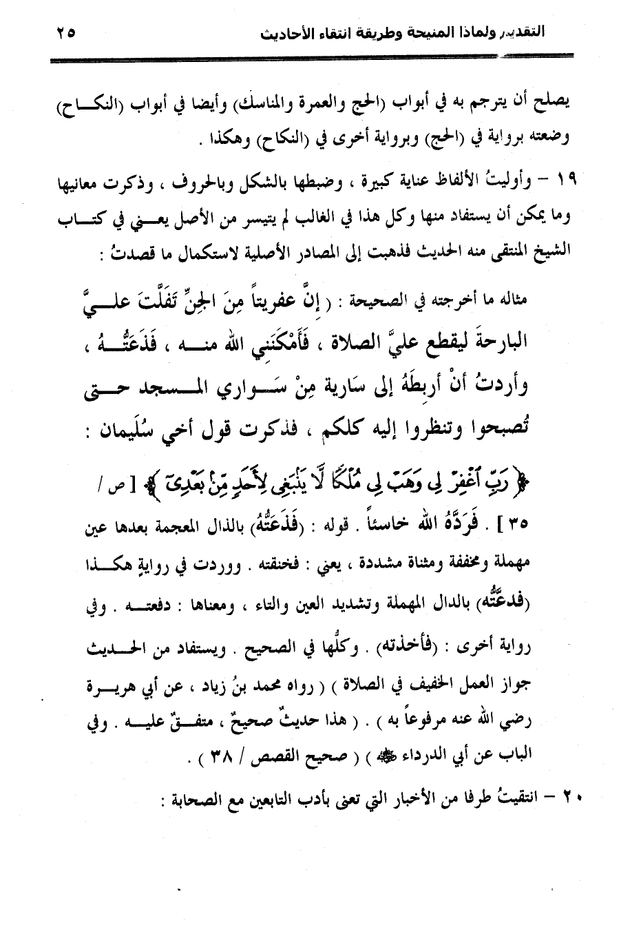19 - وأوليتُ الألفاظ عناية كبيرة، وضبطها بالشكل وبالحروف، وذكرت معانيها وما يمكن أن يستفاد منها وكل هذا في الغالب لم يتيسر من الأصل يعنى في كتاب الشيخ المنتقى منه الحديث فذهبت إلى المصادر الأصلية لاستكمال ما قصدتُ: