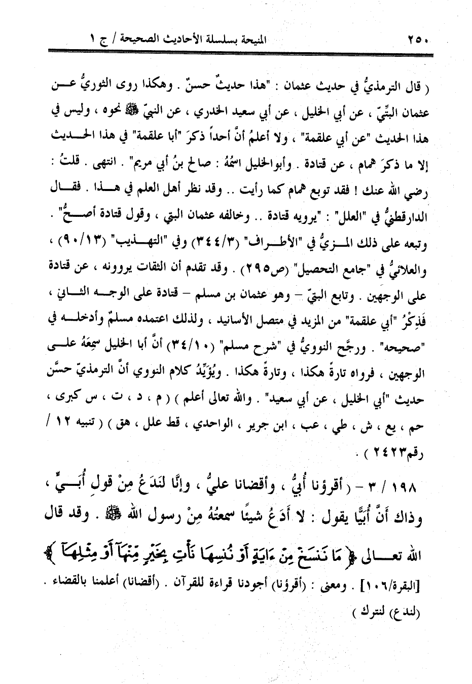 (قال الترمذيُّ في حديث عثمان: "هذا حديثٌ حسنٌ. وهكذا روى الثوريُّ عن عثمان البتِّيّ، عن أبي الخليل، عن أبي سعيد الخدري، عن النبيّ - صلى الله عليه وسلم - نحوه، وليس في هذا الحديث "عن أبي علقمة"، ولا أعلمُ أن أحدًا ذكرَ "أبا علقمة" في هذا الحديث إلا ما ذكرَ همام، عن قتادة، وأبو الخليل اسمُهُ: صالح بنُ أبي مريم". انتهى. قلتُ: رضي الله عنك! فقد توبع همام كما رأيت .. وقد نظر أهل العلم في هذا. فقال الدارقطنيُّ في "العلل": "يرويه قتادة .. وخالفه عثمان البتي، وقول قتادة أصحُّ".