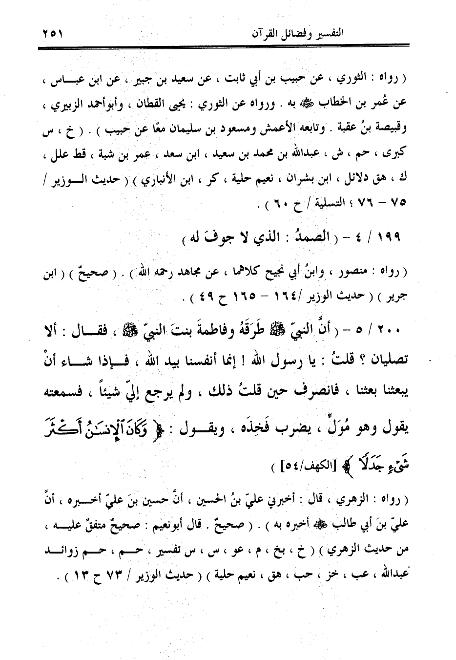 200/ 5 - (أن النبيّ - صلى الله عليه وسلم - طَرَقَهُ وفاطمةَ بنتَ النبي - صلى الله عليه وسلم -، فقال: ألا تصليان؟ قلتُ: يا رسول الله! إنما أنفسنا بيد الله، فإذا شاء أنْ يبعثنا بعثنا، فانصرف حين قلتُ ذلك، ولم يرجع إليّ شيئًا، فسمعته يقول وهو مُوَلٍّ، يضرب فَخِذَه، ويقول: {وَكَانَ الْإِنْسَانُ أَكْثَرَ شَيْءٍ جَدَلاً} [الكهف: 54]).