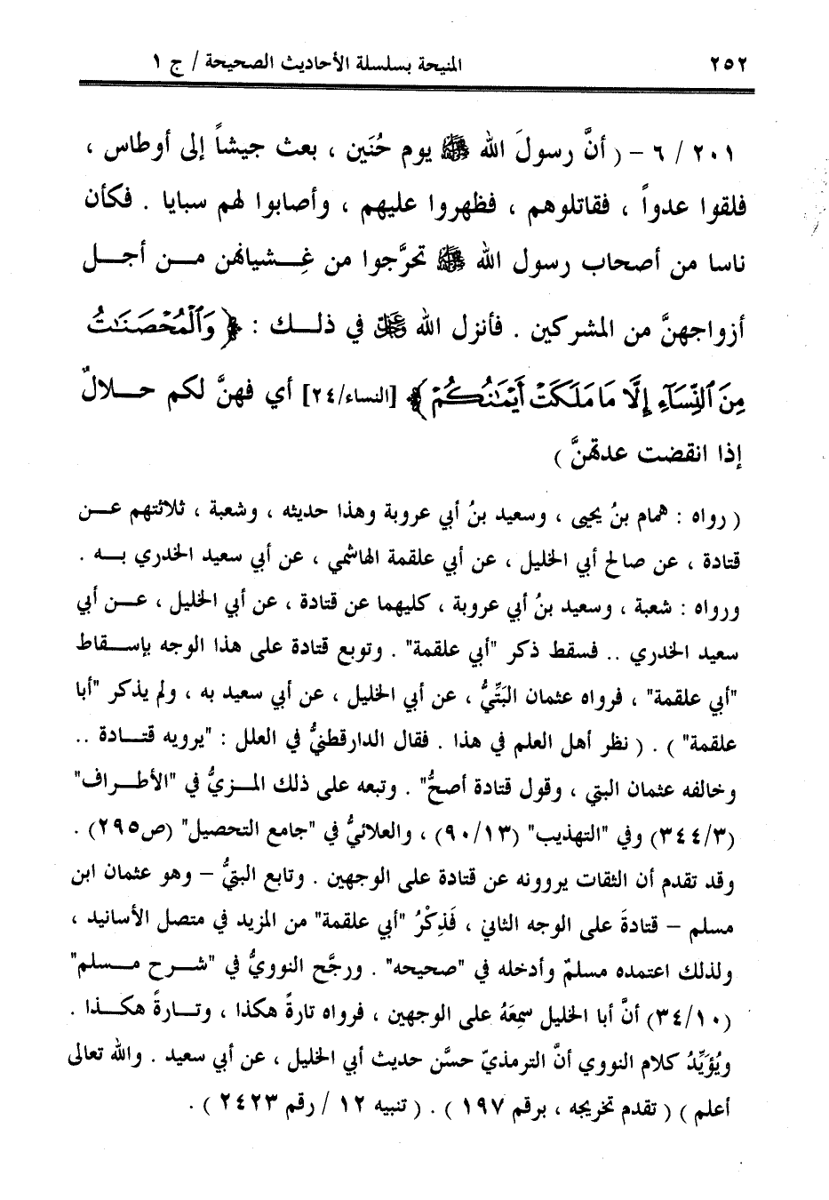 201/ 6 - (أنَّ رسولَ الله - صلى الله عليه وسلم - يوم حُنَين، بعث جيشًا إلى أوطاس، فلقوا عدوًّا، فقاتلوهم، فظهروا عليهم، وأصابوا لهم سبايا. فكأن ناسا من أصحاب رسول الله - صلى الله عليه وسلم - تحرَّجوا من غِشيانهن من أجل أزواجهنَّ من المشركين. فأنزل الله - عز وجل - في ذلك: {وَالْمُحْصَنَاتُ مِنَ النِّسَاءِ إلا مَا مَلَكَتْ أَيْمَانُكُمْ} [النساء: 24] أي فهنَّ لكم حلالٌ إذا انقضت عدتهنَّ).
