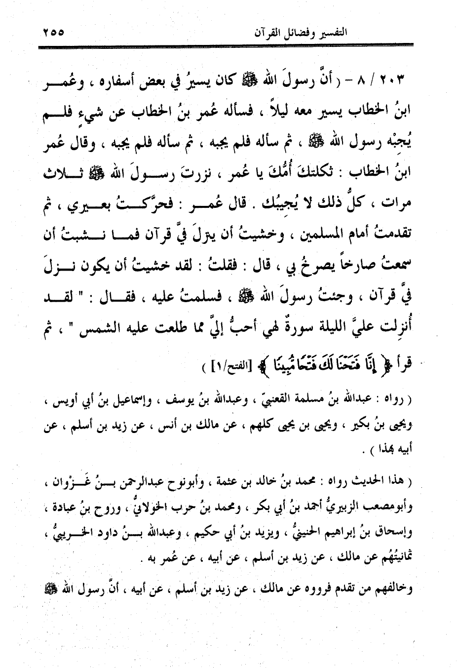 203/ 8 - (أنَّ رسولَ الله - صلى الله عليه وسلم - كان يسيرُ في بعض أسفاره، وعُمر ابنُ الخطاب يسر معه ليلًا، فسأله عُمر بنُ الخطاب عن شيءٍ فلم يُجِبْه رسول الله - صلى الله عليه وسلم -، ثم سأله فلم يجبه، ثم سأله فلم يجبه، وقال عُمر ابنُ الخطاب: ثكلتكَ أُمُّكَ يا عُمر، نزرتَ رسولَ الله - صلى الله عليه وسلم - ثلاث مرات، كلُّ ذلك لا يُجِيبُك. قال عُمر: فحرَّكتُ بعيري، ثم تقدمتُ أمام المسلمين، وخشيتُ أن ينزلَ فيَّ قرآن فما نشبتُ أن سمعتُ صارخًا يصرخُ بي، قال: فقلتُ: لقد خشيتُ أن يكون نزلَ فيَّ قرآن، وجئتُ رسولَ الله - صلى الله عليه وسلم -، فسلمتُ عليه، فقال: "لقد أُنزِلت عليَّ الليلة سورةٌ لهي أحبُّ إليَّ مما طلعت عليه الشمس"، ثم قرأ {إِنَّا فَتَحْنَا لَكَ فَتْحًا مُبِينًا (1)} [الفتح: 1]).