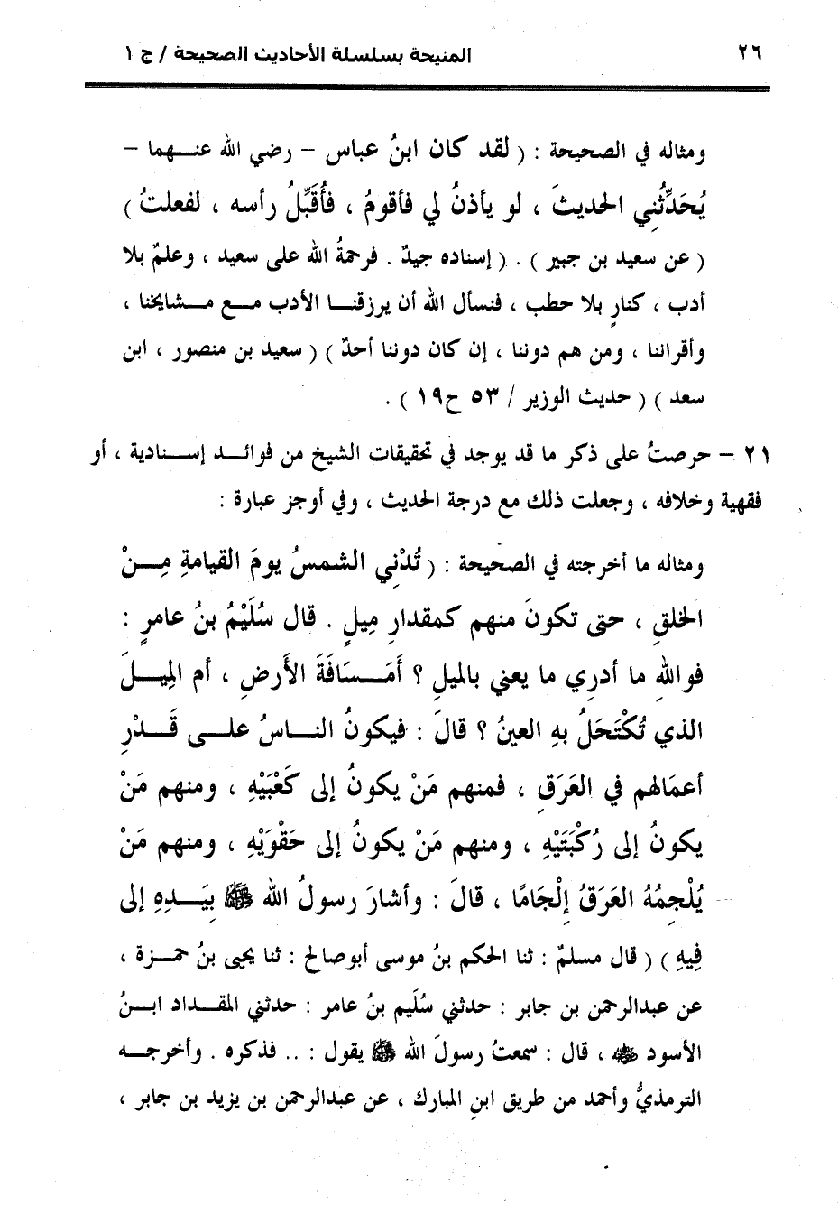 ومثاله ما أخرجته في الصحيحة: (تُدْنِي الشمسُ يومَ القيامةِ مِنْ الخلقِ، حتى تكونَ منهم كمقدارِ مِيلٍ. قال سُلَيْمُ بنُ عامرٍ: فواللهِ ما أدرِي ما يعني بالميلِ؟ أَمَسَافَةَ الأَرض، أم المِيلَ الذي تُكْتَحَلُ بهِ العينُ؟ قالَ: فيكونُ الناسُ على قَدْرِ أعمَالهم في العَرَقِ، فمنهم مَنْ يكونُ إلى كَعْبَيْهِ، ومنهم مَنْ يكونُ إلى رُكْبَتَيْهِ، ومنهم مَنْ يكونُ إلى حَقْوَيْهِ، ومنهم مَنْ يُلْجِمُهُ العَرَقُ إِلْجَامًا، قالَ: وأشارَ رسولُ الله - صلى الله عليه وسلم - بِيَدِهِ إلى فِيهِ) (قال مسلمٌ: ثنا الحكم بنُ موسى أبو صالح: ثنا يحيى بنُ حمزة، عن عبد الرحمن بن جابر: حدثني سُلَيم بنُ عامر: حدثني المقداد ابنُ الأسود - رضي الله عنه -، قال: سمعتُ رسولَ الله - صلى الله عليه وسلم - يقول: .. فذكره. وأخرجه الترمذيُّ وأحمد من طريق ابنِ المبارك، عن عبد الرحمن بن يزيد بن جابر،