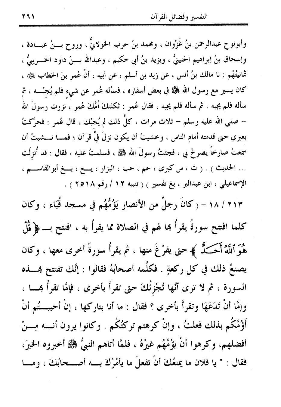 213/ 18 - (كانَ رجلٌ من الأنصار يَؤُمُّهُم في مسجد قُبَاء، وكان كلما افتتح سورةً يقرأُ لهم في الصلاة مما يقرأ به، افتتح بـ {قُلْ هُوَ اللَّهُ أَحَدٌ} حتى يفرُغَ منها، ثم يقرأ سورةً أخرى معها، وكان يصنعُ ذلك في كل ركعةٍ. فكلَّمه أصحابُهُ فقالوا: إنَّك تفتتح بهذه السورة، ثم لا ترى أنَّها تُجْزِئُكَ حتى تقرأَ بأخرى، فإمَّا تقرأ بها، وإمَّا أنْ تَدَعَهَا وتقرأَ بأخرى؛ فقال: ما أنا بتاركها، إنْ أحببتُم أنْ أَؤُمَّكُم بذلك فعلتُ، وإنْ كرهتم تركتُكُم. وكانوا يرون أنه مِنْ أفضلهم، وكرهوا أنْ يؤُمَّهُم غيرُهُ، فلمَّا أتاهم النبيُّ - صلى الله عليه وسلم - أخبروه الخبرَ، فقال: "يا فلان ما يمنعُكَ أنْ تفعلَ ما يأمُرُكَ به أصحابُكَ، وما