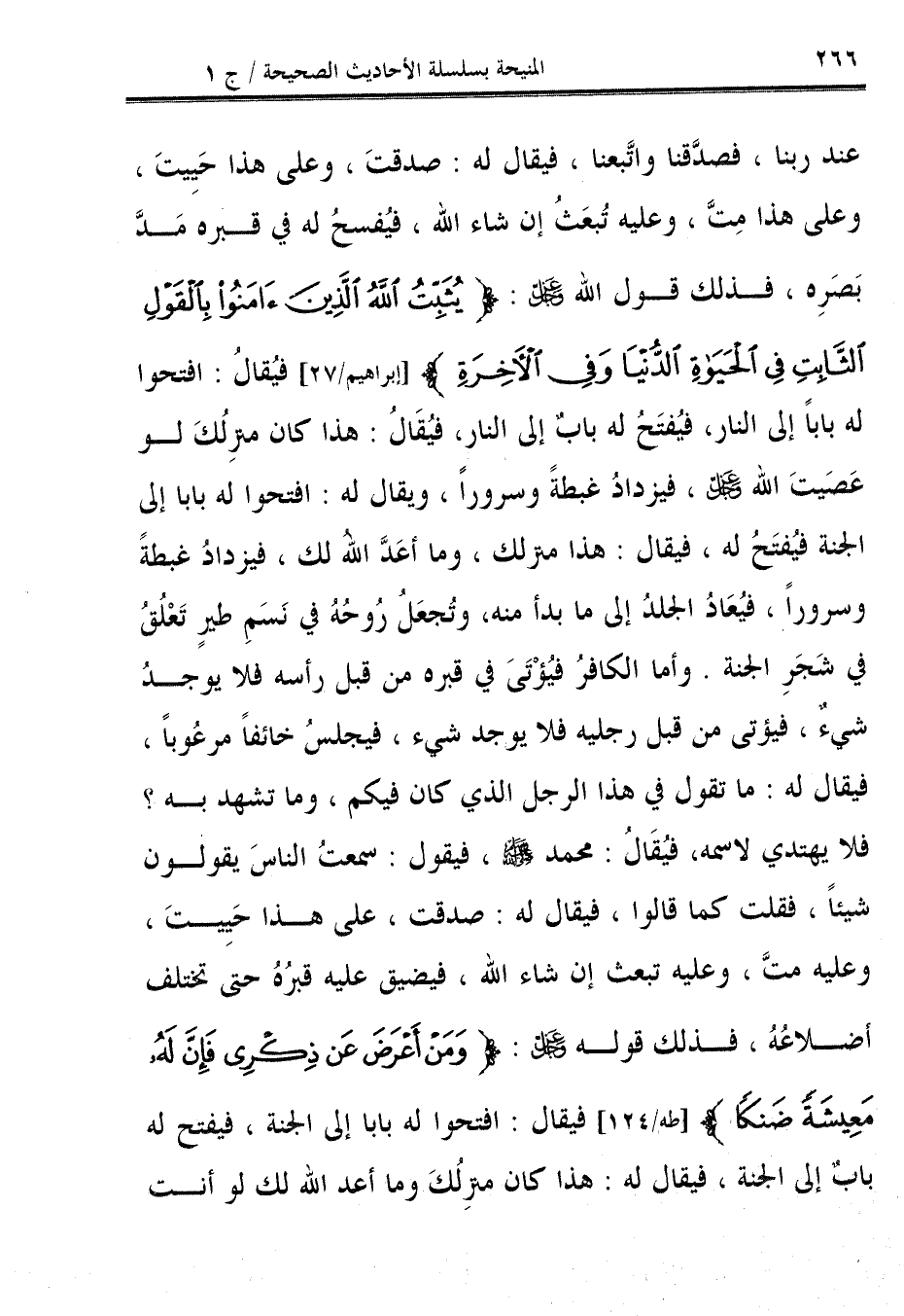 عند ربنا، فصدَّقنا واتَّبعنا، فيقال له: صدقتَ، وعلى هذا حَيِيتَ، وعلى هذا مِتَّ، وعليه تُبعَثُ إن شاء الله، فيُفسحُ له في قبره مَدَّ بَصَرِه، فذلك قول الله - عز وجل -: {يُثَبِّتُ اللَّهُ الَّذِينَ آمَنُوا بِالْقَوْلِ الثَّابِتِ فِي الْحَيَاةِ الدُّنْيَا وَفِي الْآخِرَةِ} [إبراهيم: 27] فيُقالُ: افتحوا له بابًا إلى النار، فيُفتَحُ له بابٌ إلى النار، فيُقَالُ: هذا كان منزِلُكَ لو عَصَيتَ الله - عز وجل -، فيزدادُ غبطةً وسرورًا، ويقال له: افتحوا له بابًا إلى الجنة فيُفتَحُ له، فيقال: هذا منزلك، وما أعَدُّ الله لك، فيزدادُ غبطةً وسرورًا، فيُعَادُ الجلدُ إلى ما بدأ منه، وتُجعَلُ رُوحُهُ في نَسَمِ طيرٍ تَعْلُقُ في شَجَرِ الجنة. وأما الكافرُ فيُؤْتَىَ في قبره من قبل رأسه فلا يوجدُ شيءٌ، فيؤتى من قبل رجليه فلا يوجد شيء، فيجلسُ خائفًا مرعُوبًا، فيقال له: ما تقول في هذا الرجل الذي كان فيكم، وما تشهد به؟ فلا يهتدي لاسمه، فيُقَالُ: محمد - صلى الله عليه وسلم -، فيقول: سمعتُ الناسَ يقولون شيئًا، فقلت كما قالوا، فيقال له: صدقت، على هذا حَيِيتَ، وعليه متَّ، وعليه تبعث إن شاء الله، فيضيق عليه قبرُهُ حتى تختلف أضلاعُهُ، فذلك قوله - عز وجل -: {وَمَنْ أَعْرَضَ عَنْ ذِكْرِي فَإِنَّ لَهُ مَعِيشَةً ضَنْكًا} [طه: 124] فيقال: افتحوا له بابًا إلى الجنة، فيفتح له بابٌ إلى الجنة، فيقال له: هذا كان منزِلُكَ وما أعد الله لك لو أنت