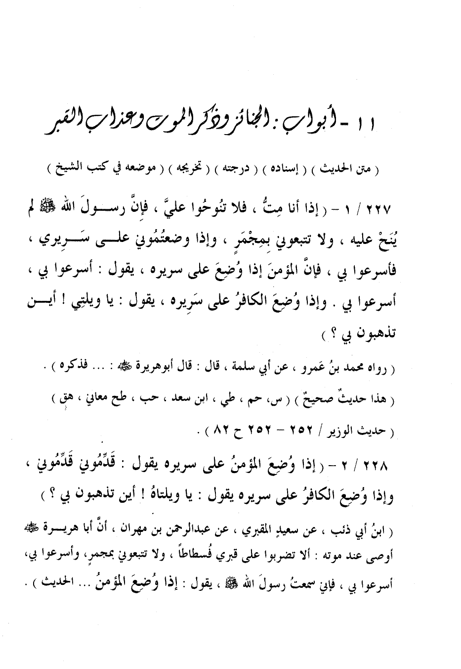 227/ 1 - (إذا أنا مِتُّ، فلا تنُوحُوا عليَّ، فإِنَّ رسولَ الله - صلى الله عليه وسلم - لم يُنَحْ عليه، ولا تتبعوني بِمِجْمَرٍ، وإذا وضعتُمُوني على سَرِيري، فأسرعوا بي، فإنَّ المؤمنَ إذا وُضِعَ على سريره، يقول: أسرعوا بي، أسرعوا بي. وإذا وُضِعَ الكافرُ على سَرِيره، يقول: يا ويلتِي! أين تذهبون بي؟).