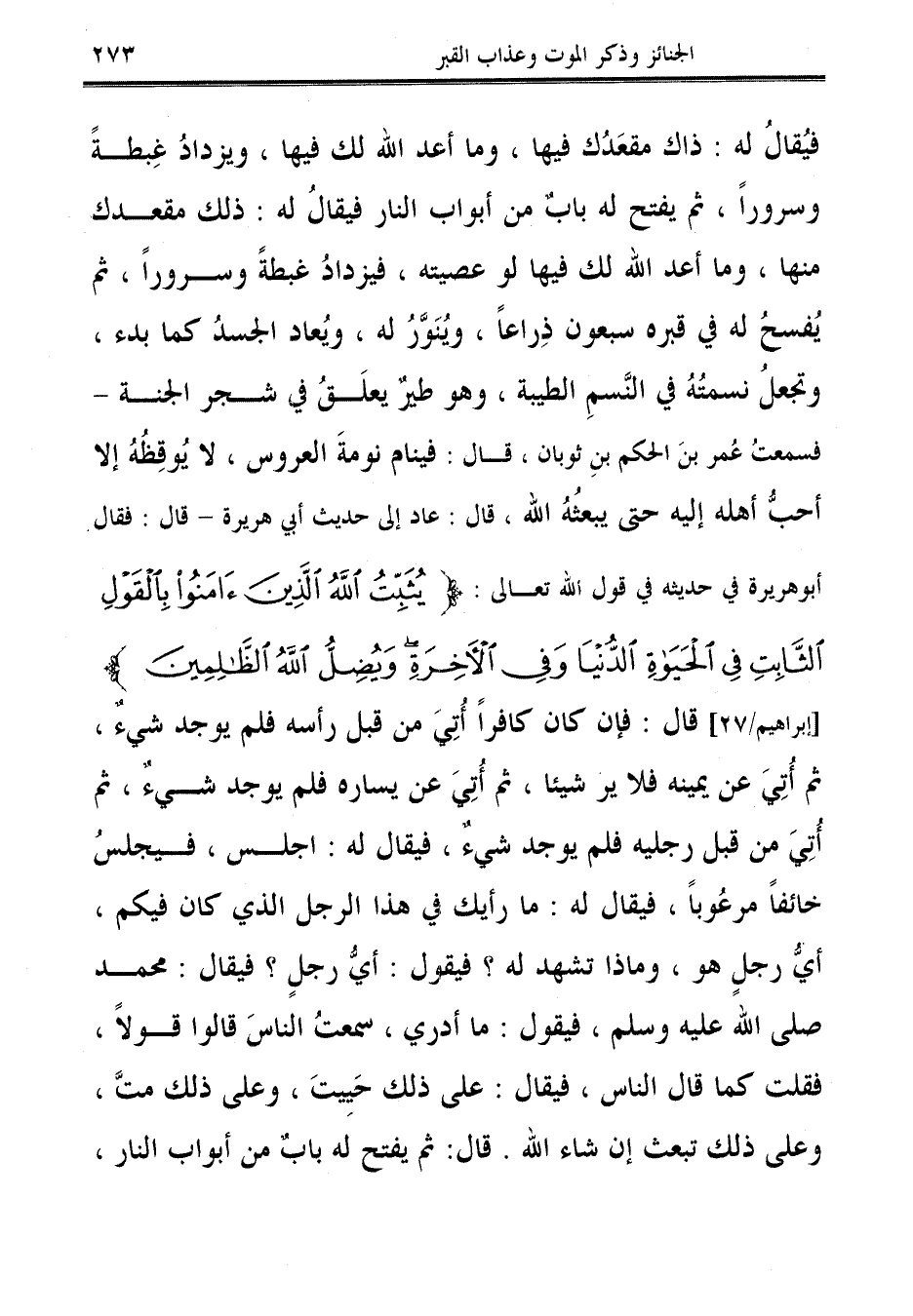 فيُقالُ له: ذاك مقعَدُك فيها، وما أعد الله لك فيها، ويزدادُ غِبطةً وسرورًا، ثمّ يفتح له بابٌ من أبواب النار فيقالُ له: ذلك مقعدك منها، وما أعد الله لك فيها لو عصيته، فيزدادُ غبطةً وسرورًا، ثمّ يُفسحُ له في قبره سبعون ذِراعًا، ويُنَوَّرُ له، ويُعاد الجسدُ كما بدء، وتجعلُ نسمتُهُ في النُّسمِ الطيبة، وهو طيرٌ يعلَقُ في شجر الجنَّة -فسمعتُ عُمر بنَ الحكم بنِ ثوبان، قال: فينام نومةَ العروس، لا يُوقِظهُ إلا أحبُّ أهله إليه حتّى يبعتهُ الله، قال: عاد إلى حديث أبي هريرة- قال: فقال أبو هريرة في حديثه في قول الله تعالى: {يُثَبِّتُ اللَّهُ الَّذِينَ آمَنُوا بِالْقَوْلِ الثَّابِتِ فِي الْحَيَاةِ الدُّنْيَا وَفِي الْآخِرَةِ وَيُضِلُّ اللَّهُ الظَّالِمِينَ} [إبراهيم: 27]، قال: فإن كان كافرًا أُتِيَ من قبل رأسه فلم يوجد شيءٌ، ثمّ أُتِيَ عن يمينه فلا ير شيئًا، ثمّ أُتِيَ عن يساره فلم يوجد شيءٌ، ثمّ أُتِيَ من قبل رجليه فلم يوجد شيءٌ، فيقال له: اجلس، فيجلسُ خائفًا مرعُوبًا، فيقال له: ما رأيك في هذا الرَّجل الّذي كان فيكم، أيُّ رجلٍ هو، وماذا تشهد له؟ فيقول: أيُّ رجلٍ؟ فيقال: محمّد صلى الله عليه وسلم، فيقول: ما أدري، سمعتُ الناسَ قالوا قولًا، فقلت كما قال النَّاس، فيقال: على ذلك حَيِيتَ، وعلى ذلك متَّ، وعلى ذلك تبعث إن شاء الله. قال: ثمّ يفتح له بابٌ من أبواب النار،