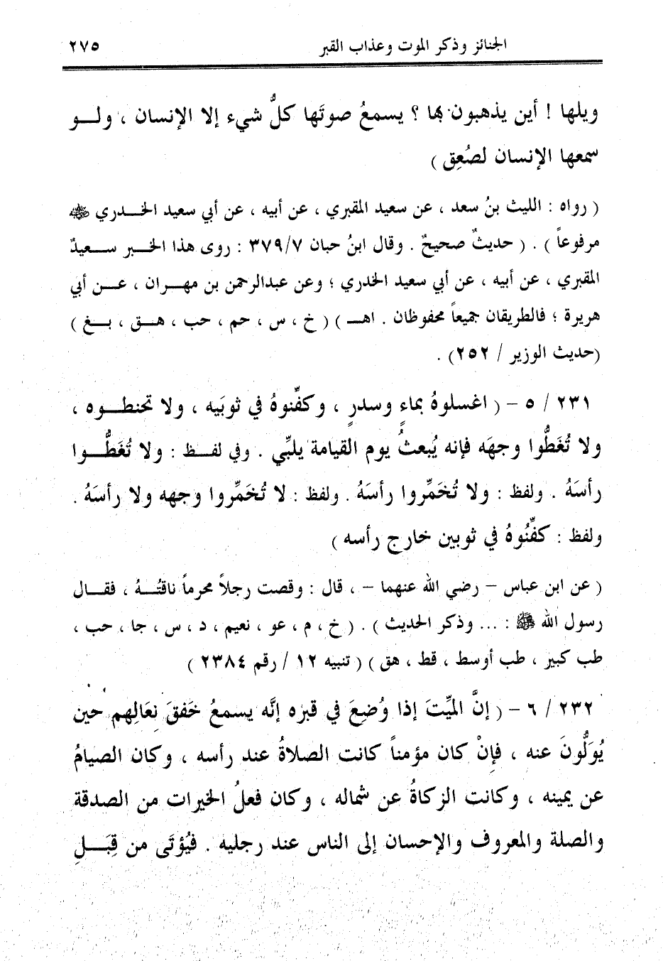 231/ 5 - (اغسلوهُ بماءٍ وسدرٍ، وكفِّنوهُ في ثوبَيه، ولا تحنطوه، ولا تُغَطُّوا وجهَه فإنَّه يُبعثُ يوم القيامة يلبّي. وفي لفظ: ولا تُغَطُّوا رأسَهُ. ولفظ: ولا تُخَمِّروا رأسَهُ. ولفظ: لا تُخَمِّروا وجهه ولا رأسَهُ. ولفظ: كفِّنُوهُ في ثوبين خارج رأسه).