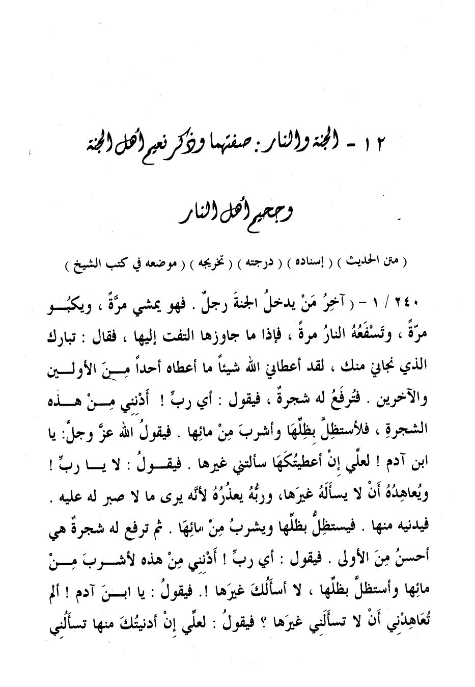 240/ 1 - (آخِرُ مَنْ يدخلُ الجنَّةَ رجلٌ. فهو يمشي مرَّةً، ويكبُو مرّةً، وتَسْفَعُهُ النارُ مرةً، فإذا ما جاوزها التفت إليها، فقال: تبارك الذي نجاني منك، لقد أعطاني الله شيئًا ما أعطاه أحدًا مِنَ الأولين والآخرين. فتُرفَعُ له شجرةٌ، فيقول: أي ربِّ! أَدْنِنِي مِنْ هذه الشجرةِ، فلأستظِلَّ بِظِلِّها وأشربَ مِنْ مائِها. فيقولُ الله عزَّ وجلَّ: يا ابن آدم! لعلِّي إِنْ أعَطيتُكَهَا سألتني غيرها. فيقولُ: لا يا ربِّ! ويُعاهِدُهُ أَنْ لا يسأَلَهُ غيرَها، وربُّهُ يعذُرُهُ لأنَّه يرى ما لا صبر له عليه. فيدنيه منها. فيستظِلُّ بظلِّها ويشربُ مِنْ مائِهَا. ثم ترفع له شجرةٌ هي أحسنُ مِنَ الأولى. فيقول: أي ربِّ! أَدْنِنِي مِنْ هذه لأشربَ مِنْ مائِها وأستظلَّ بظلِّها، لا أسأَلُكَ غيرَها!. فيقولُ: يا ابنَ آدم! ألم تُعَاهِدْنِي أَنْ لا تسأَلنِي غيرَها؟ فيقولُ: لعلِّي إِنْ أدنيتُكَ منها تساَلُنِي