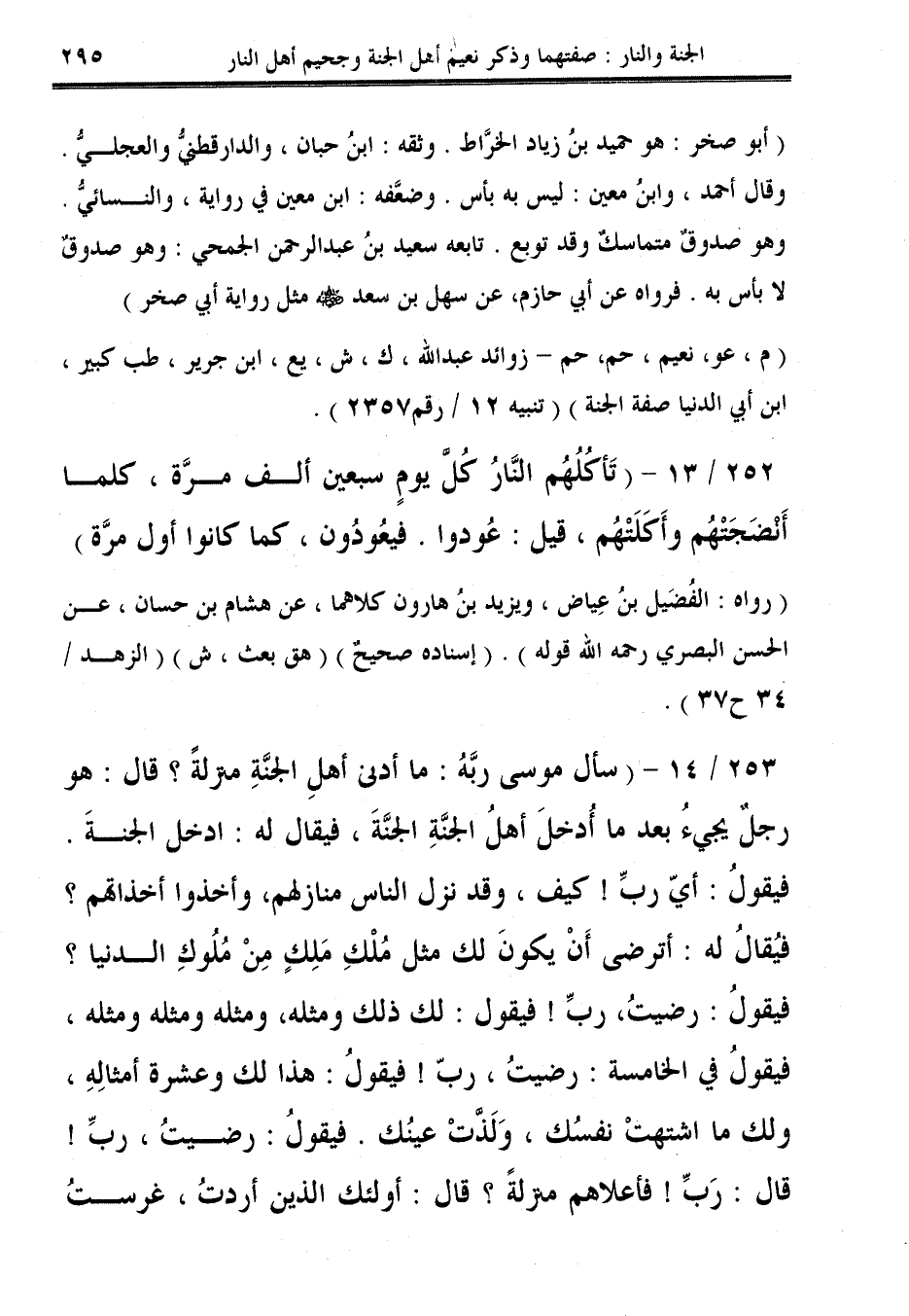 253/ 14 - (سأل موسى ربَّهُ: ما أدنى أهلِ الجنَّةِ منزلةً؟ قال: هو رجلٌ يجيءُ بعد ما أُدخلَ أهلُ الجنَّةِ الجنَّةَ، فيقال له: ادخل الجنةَ. فيقولُ: أيّ ربِّ! كيف، وقد نزل الناس منازلهم، وأخذوا أخذاتهم؟ فيُقالُ له: أترضى أَنْ يكونَ لك مثل مُلْكِ مَلِكٍ مِنْ مُلُوكِ الدنيا؟ فيقولُ: رضيتُ، ربِّ! فيقول: لك ذلك ومثله، ومثله ومثله ومثله، فيقولُ في الخامسة: رضيتُ، ربّ! فيقولُ: هذا لك وعشرة أمثالِهِ، ولك ما اشتهتْ نفسُك، وَلَذَّتْ عينُك. فيقولُ: رضيتُ، ربِّ! قال: رَبِّ! فأعلاهم منزلةً؟ قال: أولئك الذين أردتُ، غرستُ