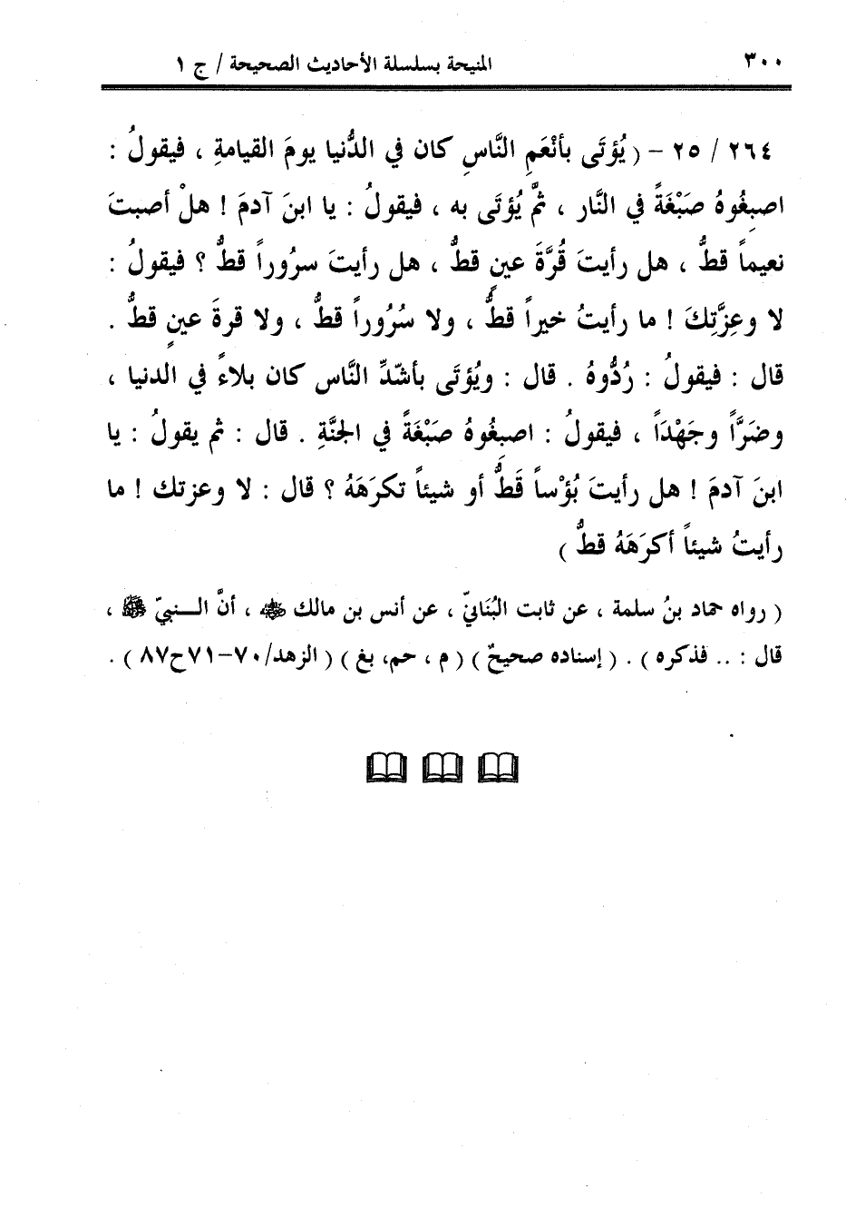 (رواه حماد بنُ سلمة، عن ثابت البُنَانّي، عن أنس بن مالك - رضي الله عنه -، أنَّ النبيّ - صلى الله عليه وسلم -، قال: .. فذكره). (إسناده صحيحٌ) (م، حم، بغ) (الزهد / 70 - 71 ح 87).