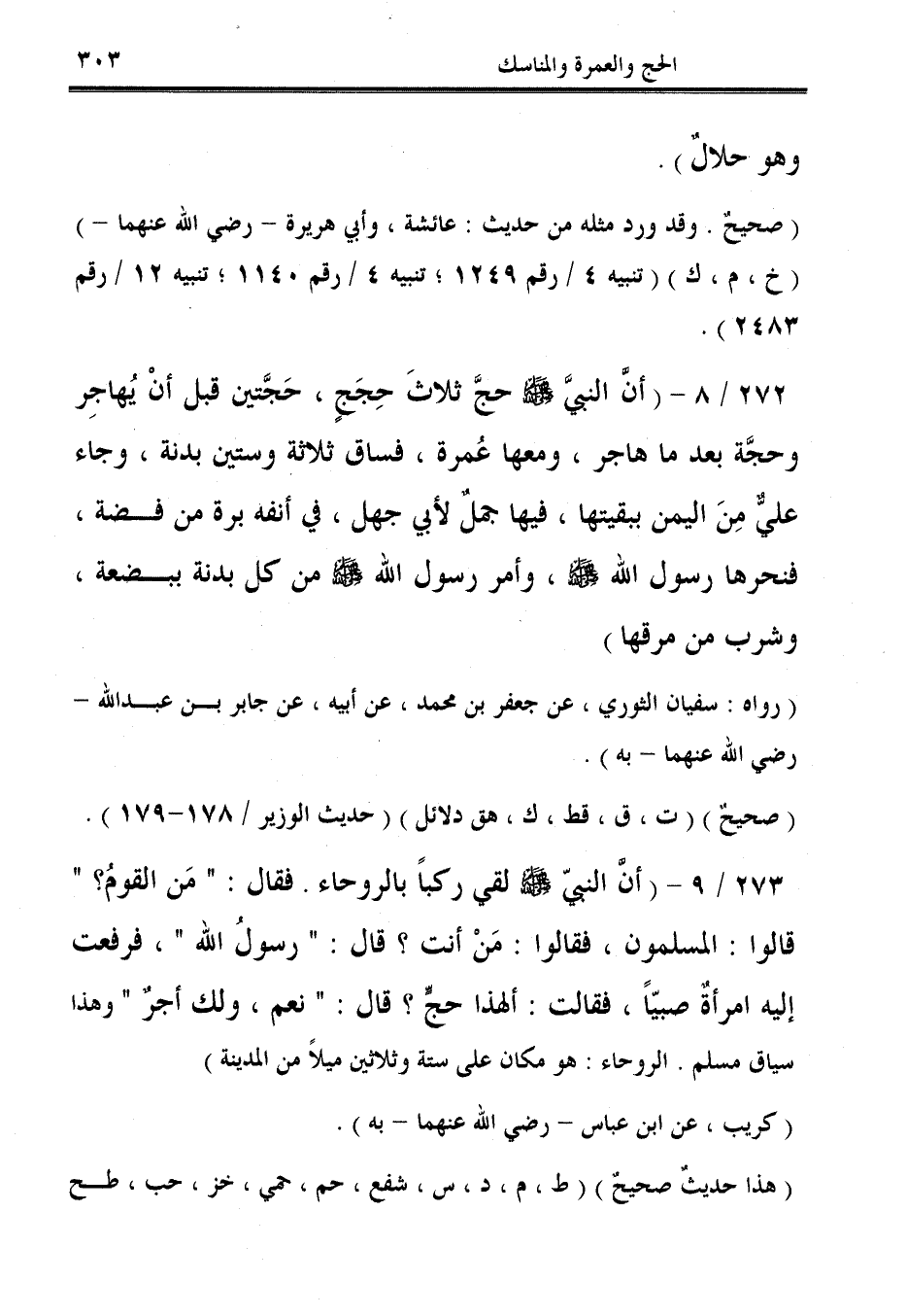 273/ 9 - (أنَّ النبيّ - صلى الله عليه وسلم - لقي ركبًا بالروحاء. فقال: "مَن القومُ؟ " قالوا: المسلمون، فقالوا: مَنْ أنت؟ قال: "رسولُ الله"، فرفعت إليه امرأةٌ صبيًّا، فقالت: ألهذا حجٌّ؟ قال: "نعم، ولك أجرٌ" وهذا سياق مسلم. الروحاء: هو مكان على ستة وثلاثين ميلًا من المدينة).