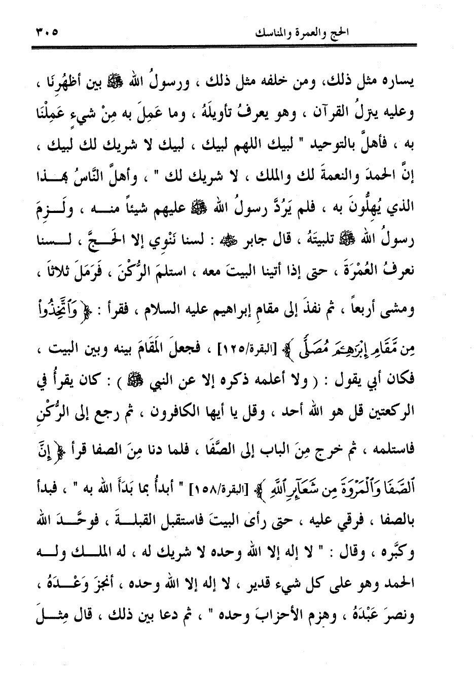يساره مثل ذلك، ومن خلفه مثل ذلك، ورسولُ الله - صلى الله عليه وسلم - بين أظهُرِنَا، وعليه ينزلُ القرآن، وهو يعرفُ تأويلَهُ، وما عَمِلَ به مِنْ شيءٍ عَمِلْنَا به، فأهلَّ بالتوحيد "لبيك اللهم لبيك، لبيك لا شريك لك لبيك، إنَّ الحمدَ والنعمةَ لك والملك، لا شريك لك"، وأهلَّ النَّاسُ بهذا الذي يُهِلُّونَ به، فلم يَرُدَّ رسولُ الله - صلى الله عليه وسلم - عليهم شيئًا منه، ولَزِمَ رسولُ الله - صلى الله عليه وسلم - تلبيتَهُ، قال جابر - صلى الله عليه وسلم -: لسنا نَنْوِي إلا الحَجَّ، لسنا نعرفُ العُمْرَةَ، حتى إذا أتينا البيتَ معه، استلمَ الرُّكْنَ، فَرَمَلَ ثلاثًا، ومشى أربعًا، ثم نفذَ إلى مقامِ إبراهيم - عليه السلام -، فقرأ: {وَاتَّخِذُوا مِنْ مَقَامِ إِبْرَاهِيمَ مُصَلًّى} [البقرة: 125]، فجعلَ المَقَامَ بينه وبين البيت، فكان أبي يقول: (ولا أعلمه ذكره إلا عن النبي - صلى الله عليه وسلم -): كان يقرأُ في الركعتين قل هو الله أحد، وقل يا أيها الكافرون، ثم رجع إلى الرُّكْنِ فاستلمه، ثم خرج مِنَ الباب إلى الصَّفَا، فلما دنا مِنَ الصفا قرأ {إِنَّ الصَّفَا وَالْمَرْوَةَ مِنْ شَعَائِرِ اللَّهِ} [البقرة: 158] "أبدأُ بما بَدَأَ الله به"، فبدأ بالصفا، فرقي عليه، حتى رأى البيتَ فاستقبل القبلةَ، فوحَّدَ الله وكبَّره، وقال: "لا إله إلا الله وحده لا شريك له، له الملك وله الحمد وهو على كل شيء قدير، لا إله إلا الله وحده، أنجزَ وَعْدَهُ، ونصرَ عَبْدَهُ، وهزم الأحزابَ وحده"، ثم دعا بين ذلك، قال مِثلَ