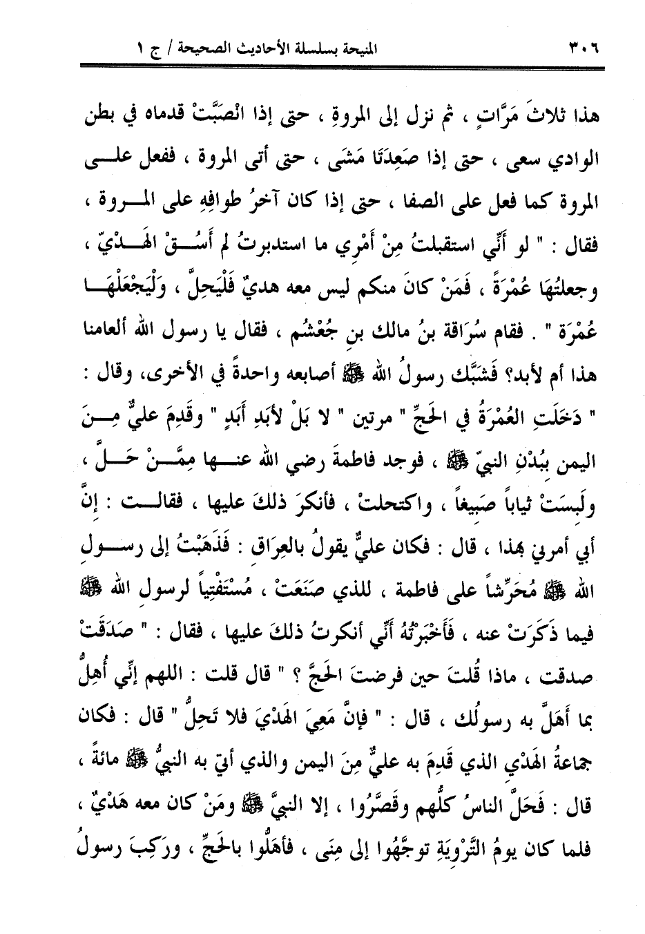 هذا ثلاثَ مَرَّاتٍ، ثم نزل إلى المروةِ، حتى إذا انْصَبَّتْ قدماه في بطن الوادي سعى، حتى إذا صَعِدَتَا مَشَى، حتى أتى المروة، ففعل على المروة كما فعل على الصفا، حتى إذا كان آخرُ طوافِهِ على المروة، فقال: "لو أَنِّي استقبلتُ مِنْ أَمْرِي ما استدبرتُ لم أَسُقْ الهَدْيّ، وجعلتُهَا عُمْرَةً، فَمَنْ كانَ منكم ليس معه هديٌ فَلْيَحِلَّ، وَلْيَجْعَلْهَا عُمْرَة". فقام سُرَاقة بنُ مالك بنِ جُعْشُم، فقال يا رسول الله ألعامنا هذا أم لأبد؟ فَشَبَّك رسولُ الله - صلى الله عليه وسلم - أصابعه واحدةً في الأخرى، وقال: "دَخَلَتِ العُمْرَةُ في الحَجِّ" مرتين "لا بَلْ لأبَدِ أَبَدٍ" وقَدِمَ عليٌّ مِنَ اليمن بِبُدْنِ النبيّ - صلى الله عليه وسلم -، فوجد فاطمةَ رضي الله عنها مِمَّنْ حَلَّ، ولَبِسَتْ ثيابًا صَبِيغًا؟ واكتحلتْ، فأنكرَ ذلكَ عليها، فقالت: إِنَّ أبي أمرني بهذا، قال: فكان عليٌّ يقولُ بالعِرَاقِ: فَذَهَبْتُ إلى رسولِ الله - صلى الله عليه وسلم - مُحَرِّشًا على فاطمة، للذي صَنَعَتْ، مُسْتَفْتِيًا لرسولِ الله - صلى الله عليه وسلم - فيما ذَكَرَتْ عنه، فَأَخْبَرْتُهُ أَنِّي أنكرتُ ذلكَ عليها، فقال: "صَدَقَتْ صدقت، ماذا قُلتَ حين فرضتَ الحَجَّ؟ " قال قلت: اللهم إنِّي أُهِلُّ بما أَهَلَّ به رسولُك، قال: "فإنَّ مَعِيَ الهَدْيَ فلا تَحِلُّ" قال: فكان جماعةُ الهَدْيِ الذي قَدِمَ به عليٌّ مِنَ اليمن والذي أتي به النبيُّ - صلى الله عليه وسلم - مائةً، قال: فَحَلَّ الناسُ كلُّهم وقَصَّرُوا، إلا النبيَّ - صلى الله عليه وسلم - ومَنْ كان معه هَدْيٌ، فلما كان يومُ التَّرْوِيَةِ توجُّهُوا إلى مِنَى، فأهَلُّوا بالحَجِّ، ورَكِبَ رسولُ
