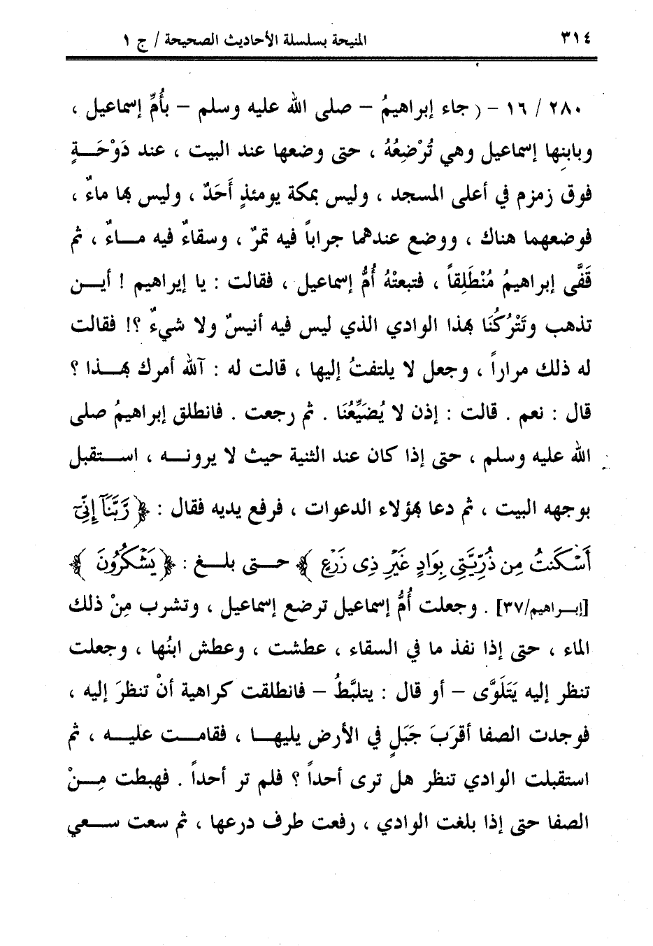 280/ 16 - (جاء إبراهيمُ - صلى الله عليه وسلم - بأُمِّ إسماعيل، وبابنِها إسماعيل وهي تُرْضِعُهُ، حتى وضعها عند البيت، عند دَوْحَةٍ فوق زمزم في أعلى المسجد، وليس بمكة يومئذٍ أَحَدٌ، وليس بها ماءٌ، فوضعهما هناك، ووضع عندهما جرابًا فيه تمرٌ، وسقاءٌ فيه ماءٌ، ثم قَفَّى إبراهيمُ مُنْطَلِقًا، فتبعتْهُ أُمُّ إسماعيل، فقالت: يا إبراهيم! أين تذهب وتَتْرُكُنَا بهذا الوادي الذي ليس فيه أنيسٌ ولا شيءٌ؟! فقالت له ذلك مرارًا، وجعل لا يلتفتُ إليها، قالت له: آلله أمرك بهذا؟ قال: نعم. قالت: إذن لا يُضَيِّعُنَا. ثم رجعت. فانطلق إبراهيمُ صلى الله عليه وسلم، حتى إذا كان عند الثنية حيث لا يرونه، استقبل بوجهه البيت، ثم دعا بهؤلاء الدعوات، فرفع يديه فقال: {رَبَّنَا إِنِّي أَسْكَنْتُ مِنْ ذُرِّيَّتِي بِوَادٍ غَيْرِ ذِي زَرْعٍ} حتى بلغ: {يَشْكُرُونَ} [إبراهيم / 37]. وجعلت أُمُّ إسماعيل ترضع إسماعيل، وتشرب مِنْ ذلك الماء، حتى إذا نفذ ما في السقاء، عطشت، وعطش ابنُها، وجعلت تنظر إليه يَتَلَوَّى -أو قال: يتلبَّطُ- فانطلقت كراهية أنْ تنظرَ إليه، فوجدت الصفا أقرَبَ جَبَلٍ في الأرض يليها، فقامت عليه، ثم استقبلت الوادي تنظر هل ترى أحدًا؟ فلم تر أحدًا. فهبطت مِنْ الصفا حتى إذا بلغت الوادي، رفعت طرف درعها، ثم سعت سعي