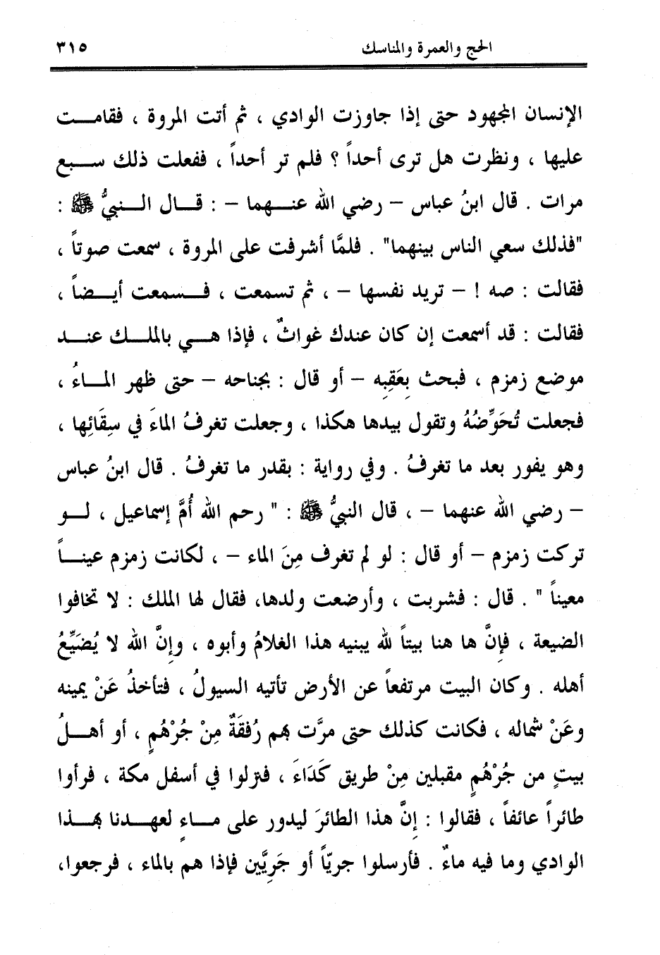 الإنسان المجهود حتى إذا جاوزت الوادي، ثم أتت المروة، فقامت عليها، ونظرت هل ترى أحدًا؟ فلم تر أحدًا، ففعلت ذلك سبع مرات. قال ابنُ عباس - رضي الله عنهما -: قال النبيُّ - صلى الله عليه وسلم -: "فذلك سعي الناس بينهما". فلمَّا أشرفت على المروة، سمعت صوتًا، فقالت: صه! -تريد نفسها-، ثم تسمعت، فسمعت أيضًا، فقالت: قد أسمعت إن كان عندك غواثٌ، فإذا هي بالملك عند موضع زمزم، فبحث بِعَقِبِه -أو قال: بجناحه- حتى ظهر الماءُ، فجعلت تُحَوِّضُهُ وتقول بيدها هكذا، وجعلت تغرفُ الماءَ في سِقَائِها، وهو يفور بعد ما تغرفُ. وفي رواية: بقدر ما تغرفُ. قال ابنُ عباس - رضي الله عنهما -، قال النبيُّ - صلى الله عليه وسلم -: "رحم الله أُمَّ إسماعيل، لو تركت زمزم -أو قال: لو لم تغرف مِنَ الماء-، لكانت زمزم عينًا معينًا". قال: فشربت، وأرضعت ولدها، فقال لها الملك: لا تخافوا الضيعة، فإِنَّ ها هنا بيتًا لله يبنيه هذا الغلامُ وأبوه، وإِنَّ الله لا يُضَيِّعُ أهله. وكان البيت مرتفعًا عن الأرض تأتيه السيولُ، فتأخذُ عَنْ يمينه وعَنْ شماله، فكانت كذلك حتى مرَّت بهم رُفقَة مِنْ جُرْهُمٍ، أو أهلُ بيتٍ من جُرْهُمٍ مقبلين مِنْ طريق كَدَاءَ، فنزلوا في أسفل مكة، فرأوا طائرًا عائفًا، فقالوا: إِن هذا الطائرَ ليدور على ماءٍ لعهدنا بهذا الوادي وما فيه ماءٌ. فأرسلوا جريًّا أو جَرِيَّين فإذا هم بالماء، فرجعوا،