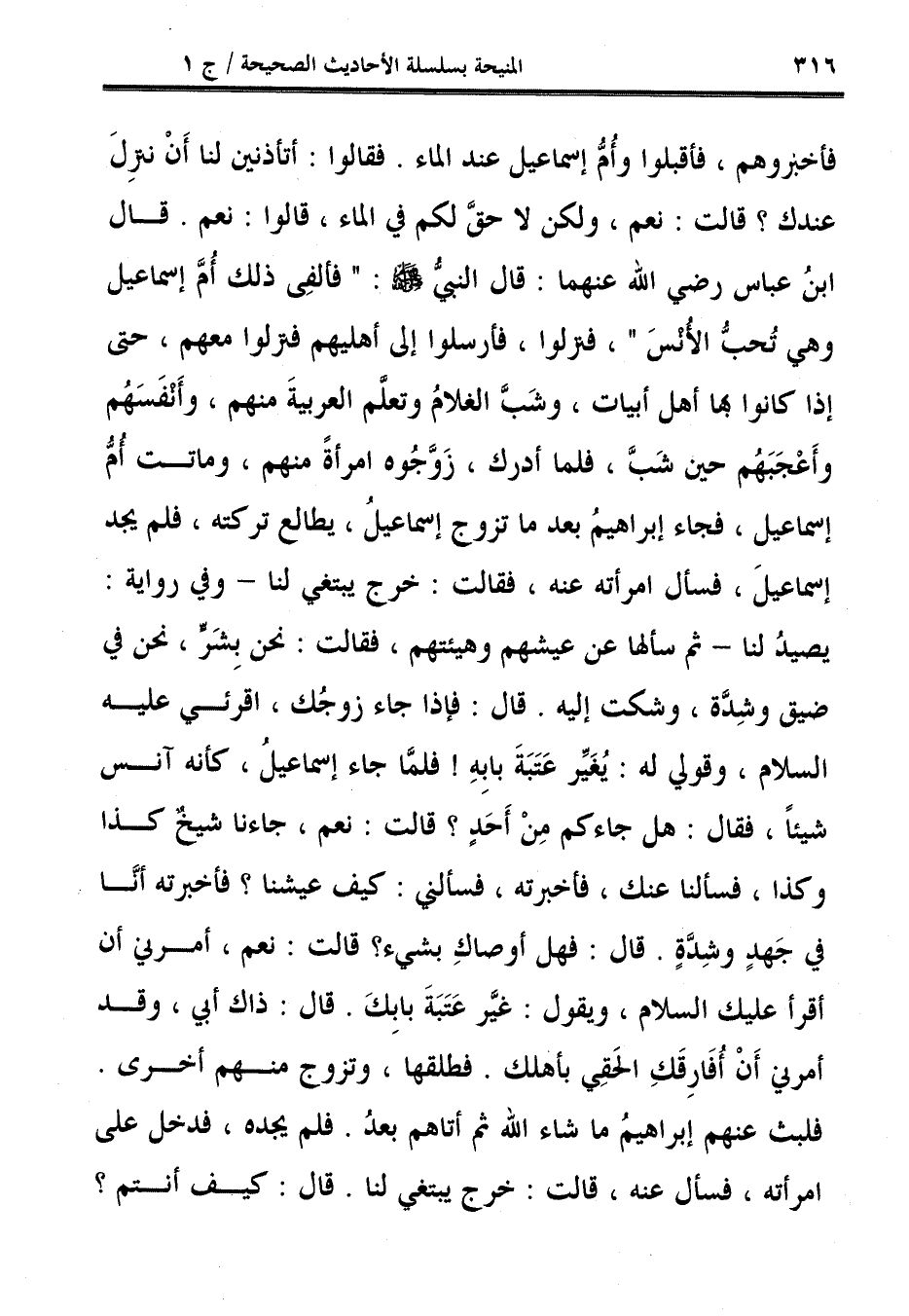 فأخبروهم، فأقبلوا وأُمُّ إسماعيل عند الماء. فقالوا: أتأذنين لنا أَنْ ننزِلَ عندك؟ قالت: نعم، ولكن لا حقَّ لكم في الماء، قالوا: نعم. قال ابنُ عباس رضي الله عنهما: قال النبيُّ - صلى الله عليه وسلم -: "فألفِى ذلك أُمَّ إسماعيل وهي تُحبُّ الأُنْسَ"، فنزلوا، فأرسلوا إلى أهليهم فنزلوا معهم، حتى إذا كانوا بها أهل أبيات، وشَبَّ الغلامُ وتعلَّم العربيةَ منهم، وأَنْفَسَهُم وأَعْجَبَهُم حين شَبَّ، فلما أدرك، زَوَّجُوه امرأةً منهم، وماتت أُمُّ إسماعيل، فجاء إبراهيمُ بعد ما تزوج إسماعيلُ، يطالع تركته، فلم يجد إسماعيلَ، فسأل امرأته عنه، فقالت: خرج يبتغي لنا -وفي رواية: يصيدُ لنا- ثم سألها عن عيشهم وهيئتهم، فقالت: نحن بِشَرٍّ، نحن في ضيق وشِدَّة، وشكت إليه. قال: فإذا جاء زوجُك، اقرئي عليه السلام، وقولي له: يُغَيِّر عَتَبَةَ بابِهِ! فلمَّا جاء إسماعيلُ، كأنه آنس شيئًا، فقال: هل جاءكم مِنْ أَحَدٍ؟ قالت: نعم، جاءنا شيخٌ كذا وكذا، فسألنا عنك، فأخبرته، فسألني: كيف عيشنا؟ فأخبرته أنَّا في جَهدٍ وشِدَّةٍ. قال: فهل أوصاكِ بشيء؟ قالت: نعم، أمرني أن أقرأ عليك السلام، ويقول: غيَّر عَتَبَةَ بابِكَ. قال: ذاك أبي، وقد أمرني أَنْ أُفَارِقَكِ الحَقِي بأهلك. فطلقها، وتزوج منهم أخرى. فلبث عنهم إبراهيمُ ما شاء الله ثم أتاهم بعدُ. فلم يجده، فدخل على امرأته، فسأل عنه، قالت: خرج يبتغي ك. قال: كيف أنتم؟