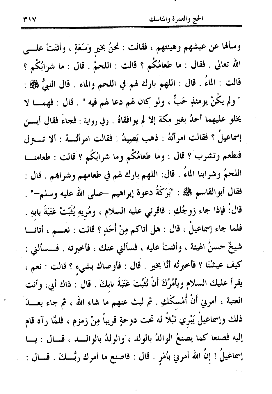 وسألها عن عيشهم وهيئتهم، فقالت: نحنُ بخيرٍ وَسَعَةٍ، وأثنَتْ على الله تعالى. فقال: ما طعامُكُم؟ قالت: اللحمُ. قال: ما شرابُكُم؟ قالت: الماءُ. قال: اللهم بارك لهم في اللحم والماء. قال النبيُّ - صلى الله عليه وسلم -: "ولم يكُنْ يومئذٍ حَبٌّ، ولو كان لهم دعا لهم فيه". قال: فهما لا يخلو عليهما أحدُ بغير مكة إلا لم يوافقاهُ. وفي رواية: فجاءَ فقال أين إسماعيلُ؟ فقالت امرأتُهُ: ذهب يَصِيدُ. فقالت امرأتُهُ: ألا تنزل فتطعم وتشرب؟ قال: وما طعامُكُم وما شرابُكُم؟ قالت: طعامنا اللحمُ وشرابنا الماءُ. قال: اللهم بارك لهم في طعامهم وشرابهم. قال: فقال أبو القاسم - صلى الله عليه وسلم -: "بَرَكَةُ دعوة إبراهيم - صلى الله عليه وسلم -". قال: فإذا جاء زوجُكِ، فاقرئي - عليه السلام -، ومُرِيهِ يُثَبّتْ عَتَبَةَ بابِهِ. فلما جاء إسماعيلُ، قال: هل أتاكم مِنْ أَحَدٍ؟ قالت: نعم، أتانا شيخٌ حسنُ الهيئة، وأثنتْ عليه، فسألني عنك، فأخبرته. فسألني: كيف عيشُنَا؟ فأخبرتُه أنَّا بخير. قال: فأوصاك بشيءٍ؟ قالت: نعم، يقرأ عليك السلام ويأمُرُكَ أَنْ تُثَبِّتَ عَتَبَةَ بابِكَ. قال: ذاك أبي، وأنت العتبة، أمرني أَنْ أمْسِكَكِ. ثم لبث عنهم ما شاء الله، ثم جاء بعدَ ذلك وإسماعيلُ يَبْرِي نَبْلًا له تحت دوحةٍ قريبًا مِنْ زمزم، فلمَّا رآه قام إليه فصنعا كما يصنعُ الوالدُ بالولد، والولدُ بالوالد، قال: يا إسماعيلُ! إِن الله أمرني بأمْرٍ. قال: فاصنع ما أمرك ربُّكَ. قال: