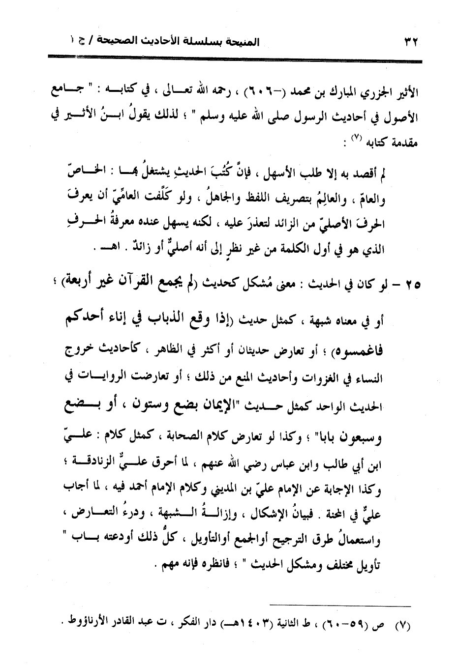 25 - لو كان في الحديث: معنى مُشكل كحديث (لم يجمع القرآن غير أربعة)؛ أو في معناه شبهة، كمثل حديث (إذا وقع الذباب في إناء أحدكم فاغمسوه)؛ أو تعارض حديثان أو أكثر في الظاهر، كأحاديث خروج النساء في الغزوات وأحاديث المنع من ذلك؛ أو تعارضت الروايات في الحديث الواحد كمثل حديث "الإيمان بضع وستون، أو بضع وسبعون بابًا"؛ وكذا لو تعارض كلام الصحابة، كمثل كلام: عليّ ابن أبي طالب وابن عباس رضي الله عنهم، لما أحرق عليٌّ الزنادقة؛ وكذا الإجابة عن الإمام عليّ بن المديني وكلام الإمام أحمد فيه، لما أجاب عليٌّ في المحنة. فبيانُ الإشكال، وإزالةُ الشبهة، ودرءُ التعارض، واستعمالُ طرق الترجيح أو الجمع أو التأويل، كلُّ ذلك أودعته باب "تأويل مختلف ومشكل الحديث"؛ فانظره فإنه مهم.