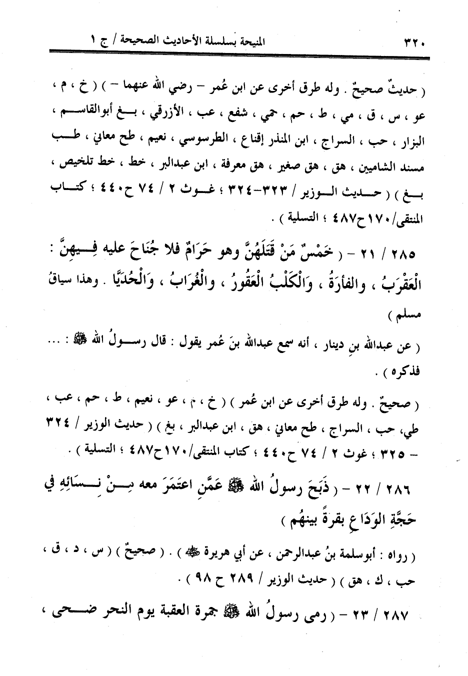 285/ 21 - (خَمْسٌ مَنْ قَتَلَهُنَّ وهو حَرَامٌ فلا جُنَاحَ عليه فِيهِنَّ: الْعَقْرَبُ، والفأرَةُ، وَالْكَلْبُ الْعَقُورُ، والْغُرَابُ، وَالْحُدَيَّا. وهذا سياقُ مسلم).