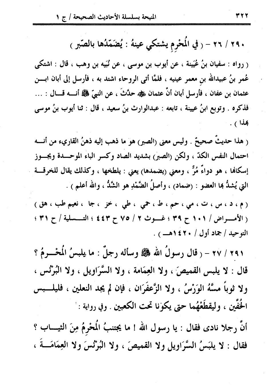 290/ 26 - (في المُحْرِمِ يشتكي عينهُ: يُضَمّدُها بالصّبر).