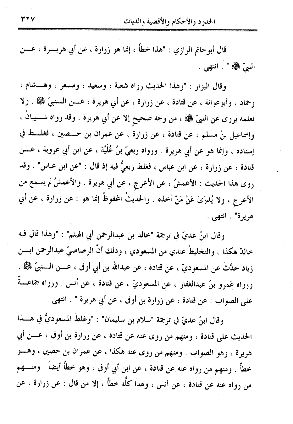 وقال ابنُ عديّ في ترجمة "سلام بن سليمان": "وغلطَ المسعوديُّ في هذا الحديث على قتادة، ومنهم من روى عنه عن قتادة، عن زرارة بن أوفى، عن أبي هريرة، وهو الصواب. ومنهم من روى عنه هكذا، عن عمران بن حصين، وهو خطأٌ. ومنهم من رواه عنه عن قتادة، عن ابن أبي أوفى، وهو خطأٌ أيضًا. ومنهم من رواه عنه عن قتادة، عن أنس، وهذا كلُّه خطأٌ، إلا من قال: عن زرارة، عن