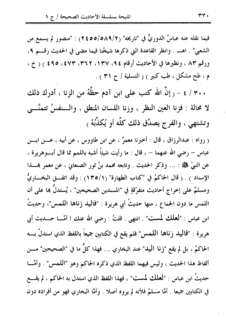 (رواه: عبد الرزاق، قال: أخبرنا معمرٌ، عن ابن طاووس، عن أبيه، عن ابن عباس - رضي الله عنهما -، قال: ما رأيت شيئًا أشبه باللمم مما قال أبو هريرة، عن النبيّ: ... وذكر الحديث. وتابعه محمد بنُ ثور الصنعاني، عن معمر بهذا الإسناد). (قال الحاكمُ في "كتاب الطهارة" (1/ 135): وقد اتفق البخاريُّ ومسلمٌ على إخراج أحاديث متفرّقةٍ في "المسندين الصحيحين"، يُستدلُّ بها على أن اللمس ما دون الجماع، منها حديثُ أبي هريرة: "فاليد زناها اللمس"، وحديثُ ابن عباس: "لعلك لمست". انتهى. قلتُ: رضي الله عنك! أمَّا حديث أبي هريرة: "فاليد زناها اللمس" فدم يقع في الكتابين جميعًا باللفظ الذي استدلَّ به الحاكمُ، بل لم يقع "زنا اليد" عند البخاري ... فهذا كلُّ ما في "الصحيحين" من ألفاظ هذا الحديث، وليس فيهما اللفظ الذي ذكره الحاكم وهو "اللمس". وأمَّا حديثُ ابن عباس: "لعلك لمست"، فهذا اللفظ الذي استدل به الحاكم، لم يقع في الكتابين جميعا. أمَّا مسلمٌ فلأنه لم يروه أصلا. وأمَّا البخاري فهو من أفراده دون