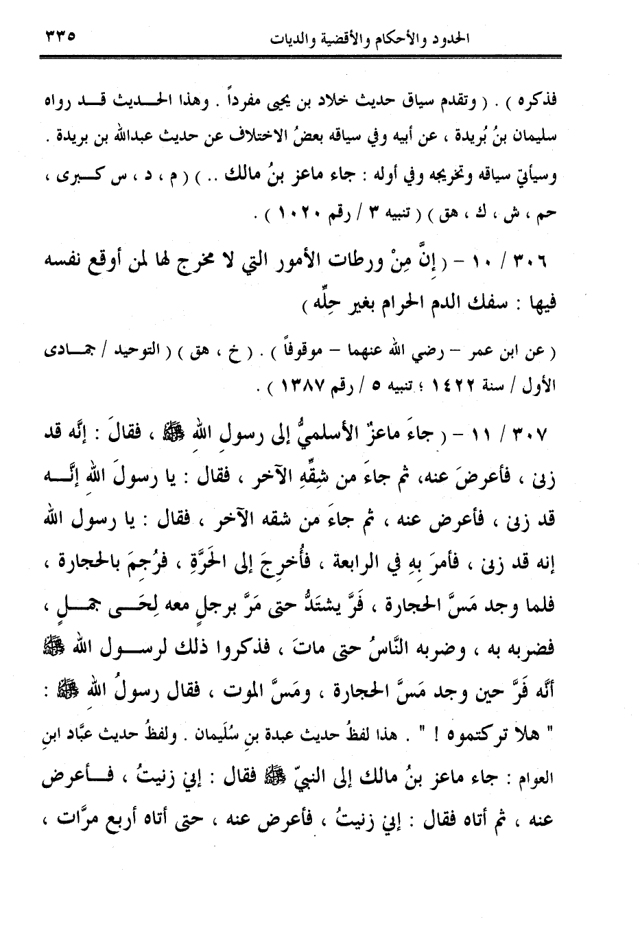 307/ 11 - (جاءَ ماعزٌ الأسلميُّ إلى رسولِ اللهِ - صلى الله عليه وسلم -، فقالَ: إنَّه قد زنى، فأعرضَ عنه، ثم جاءَ من شِقِّهِ الآخر، فقال: يا رسولَ اللهِ إنه قد زنى، فأعرض عنه، ثم جاءَ من شقه الآخر، فقال: يا رسول الله إنه قد زنى، فأمرَ بِهِ في الرابعة، فأُخرِجَ إلى الحَرَّةِ، فرُجِمَ بالحجارة، فلما وجد مَسَّ الحجارة، فَرَّ يشتَدُّ حتى مَرّ برجلٍ معه لِحَى جملٍ، فضربه به، وضربه النَّاسُ حتى ماتَ، فذكروا ذلك لرسول الله - صلى الله عليه وسلم - أنه فَرَّ حين وجد مَسَّ الحجارة، ومَسَّ الموت، فقال رسولُ اللهِ - صلى الله عليه وسلم -: "هلا تركتموه! ". هذا لفظُ حديث عبدة بنِ سُلَيمان. ولفظُ حديث عبَّاد ابنِ العوام: جاء ماعز بنُ مالك إلى النبي - صلى الله عليه وسلم - فقال: إني زنيتُ، فأعرض عنه، ثم أتاه فقال: إني زنيتُ، فأعرض عنه، حتى أتاه أربع مرَّات،