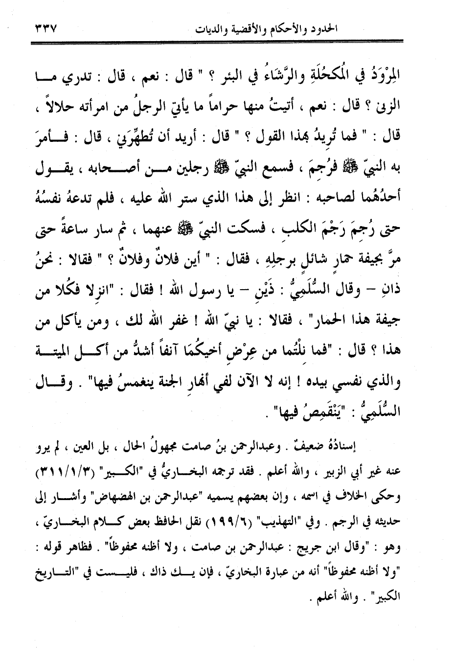 إسنادُهُ ضعيفٌ. وعبد الرحمن بنُ صامت مجهولُ الحال، بل العين، لم يرو عنه غير أبي الزبير، والله أعلم. فقد ترجمه البخاريُّ في "الكبير" (3/ 1 / 311) وحكى الخلاف في اسمه، وإن بعضهم يسميه "عبد الرحمن بن الهضهاض" وأشار إلى حديثه في الرجم. وفي "التهذيب" (6/ 199) نقل الحافظ بعض كلام البخاريّ، وهو: "وقال ابن جريج: عبد الرحمن بن صامت، ولا أظنه محفوظًا". فظاهر قوله: "ولا أظنه محفوظًا" أنه من عبارة البخاريّ، فإن يك ذاك، فليست في "التاريخ الكبير". والله أعلم.