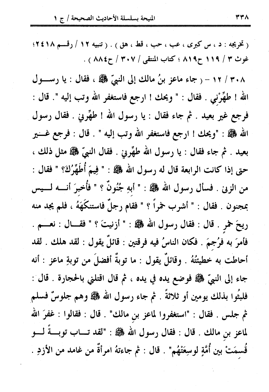 308/ 12 - (جاء ماعز بنُ مالك إلى النبي - صلى الله عليه وسلم -، فقال: يا رسول الله! طهِّرْنِي. فقال: "ويحك! ارجع فاستغفر الله وتب إليه". قال: فرجع غير بعيد. ثم جاء فقال: يا رسول الله! طهّرني. فقال رسول الله - صلى الله عليه وسلم -: "ويحك! ارجع فاستغفر الله وتب إليه". قال: فرجع غير بعيد. ثم جاء فقال: يا رسول الله طهِّرني. فقال النبيّ - صلى الله عليه وسلم - مثل ذلك، حتى إذا كانت الرابعة قال له رسول الله - صلى الله عليه وسلم -: "فِيمَ أُطَهِّرُكَ؟ " فقال: من الزنى. فسأل رسول الله - صلى الله عليه وسلم -: "أبِهِ جُنُونٌ؟ " فأُخبِرَ أنه ليس بمجنون. فقال: "أشرب خمرًا؟ " فقام رجل فاستنكَهَهُ، فلم يجد منه ريحَ خمرٍ. قال: فقال رسول الله - صلى الله عليه وسلم -: "أزنيتَ؟ " فقال: نعم. فأمرَ به فرُجِمَ. فكان الناسُ فيه فرقتين: قائلٌ يقول: لقد هلك. لقد أحاطت به خطيئتُهُ. وقائلٌ يقول: ما توبةٌ أفضلَ من توبةِ ماعز: أنه جاء إلى النبيّ - صلى الله عليه وسلم - فوضع يده في يده، ثم قال اقتلني بالحجارة. قال: فلبثُوا بذلك يومين أو ثلاثةً. ثم جاء رسول الله - صلى الله عليه وسلم - وهم جلوسٌ فسلم ثم جلس. فقال: "استغفروا لماعز بنِ مالك". قال: فقالوا: غفرَ الله لماعز بنِ مالك. قال: فقال رسول الله - صلى الله عليه وسلم -: "لقد تاب توبةً لو قُسِمَتْ بين أُمَّةٍ لوسِعَتْهُم". قال: ثم جاءتهُ امرأةٌ من غامد من الأزدِ.