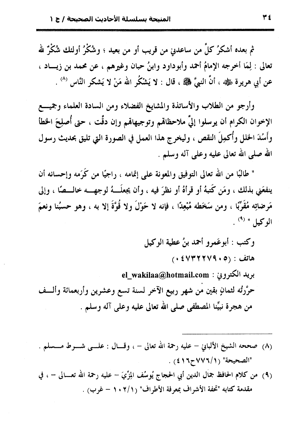 بريد الكتروني: [email protected] حرَّرتُه لثمانٍ بقين من شهر ربيع الآخر لسنة تسع وعشرين وأربعمائة وألف من هجرة نبيِّنا المصطفى صلى الله تعالى عليه وعلى آله وسلم.